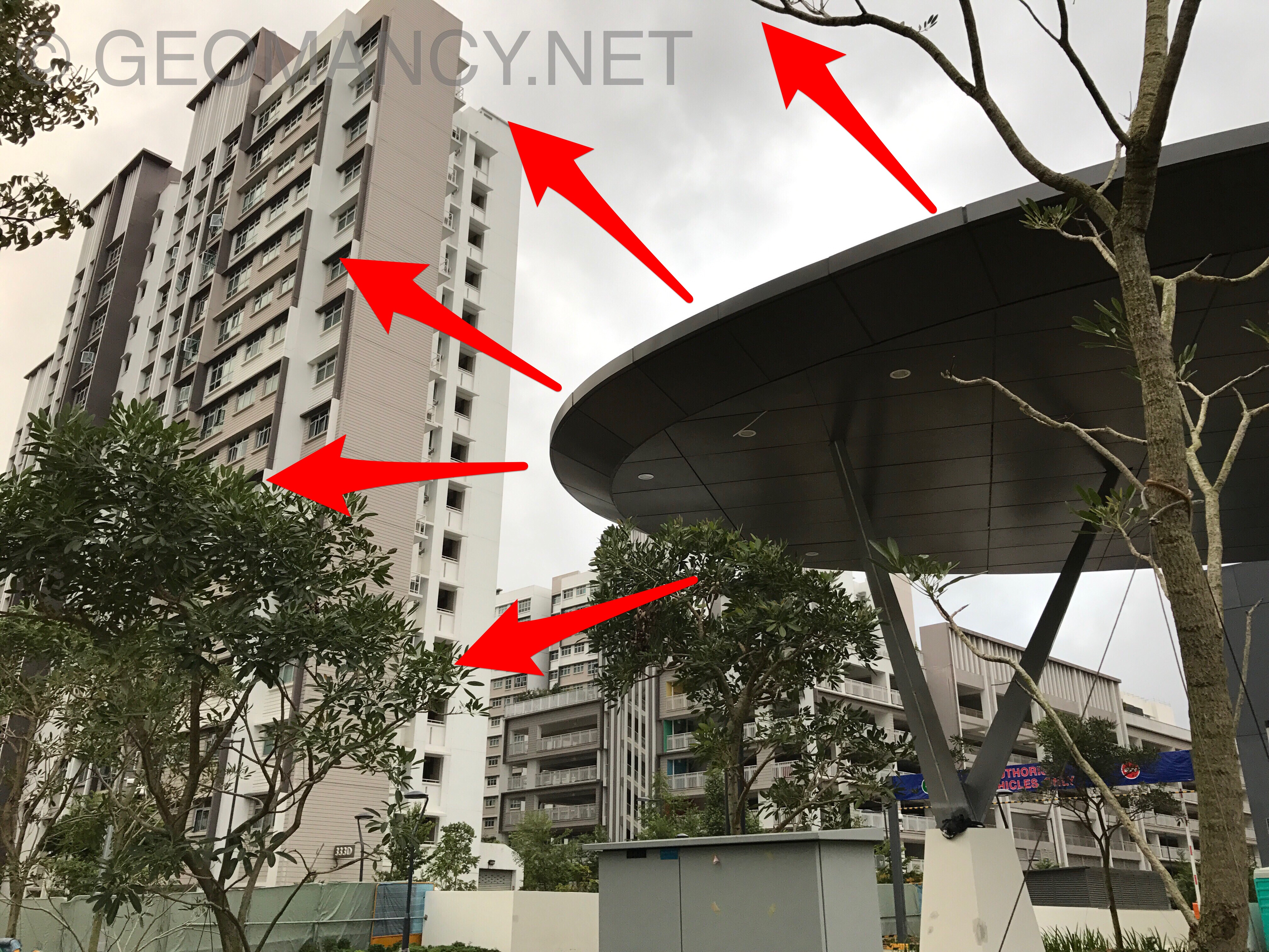 July 11, 20178 yr Author Staff The red arrows shows the Sha Qi or poison arrow from the sharp edges of the entire roof-line radiating outwards.