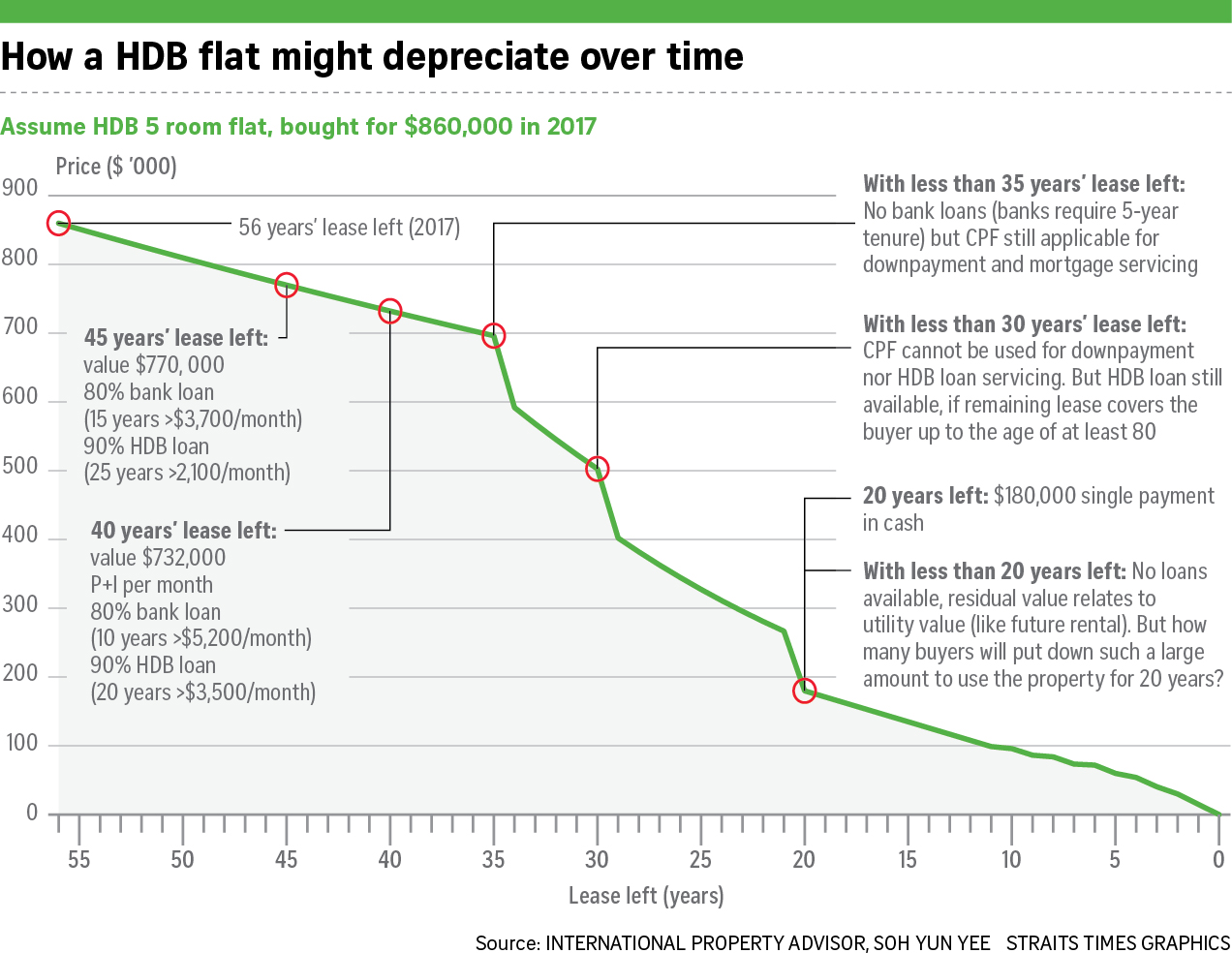 April 15, 20178 yr Author Staff Look at this chart from International Property Advisors reproduced by the Straits Times: Downgrade or surrender Any flats with remaining 60 - 56 years lease or less... needs careful planning when buying such a unit. Unless, it is "free" or at a "fire-sale". This is certainly doubtful. New or 10 to 20 years old... may still be palatable...