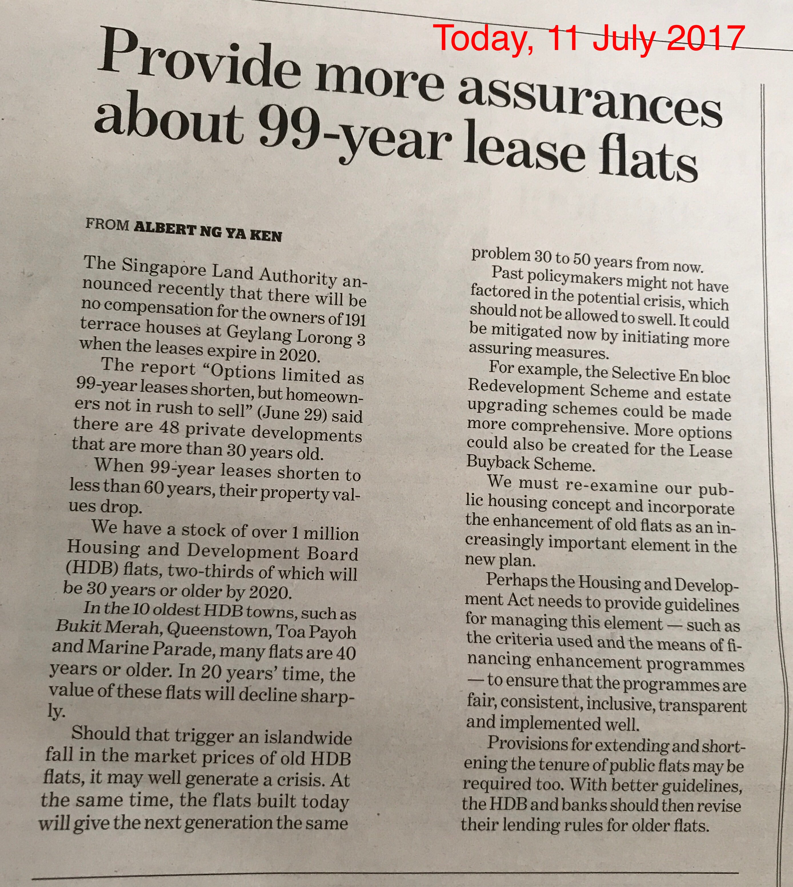 July 11, 20178 yr Author Staff Provide more assurance about 99-year lease flats No compensation for the 191 terrace leasehold houses which expires in 2020.