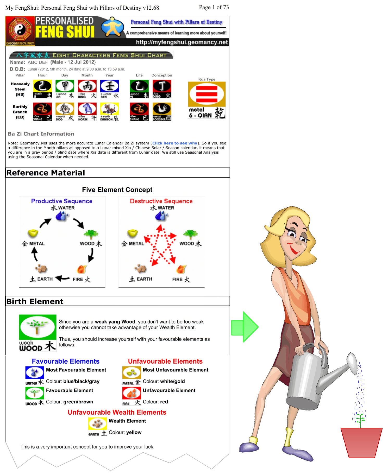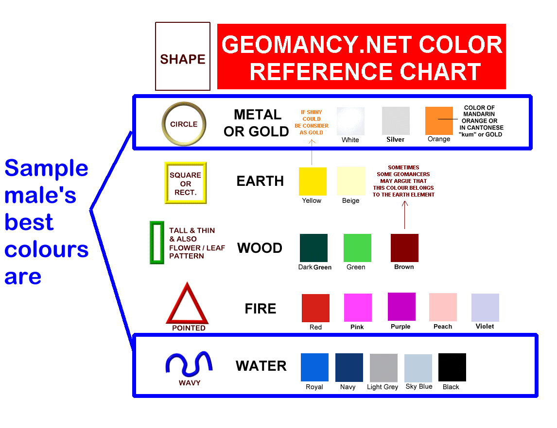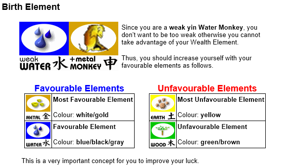 August 3, 20178 yr Staff You can use the free calculator to find out your personalised colours: https://www.geomancy.net/content/personalised-reports/generate-free-feng-shui-reports/find-your-chinese-horoscope-sign-personal-ba-zi-element Create an account and click on the first icon for your Free report on best colours:- Zoomed in showing this Sample male's birth element. In this sample, this person is a weak water person. And his best colours are metal and water:-