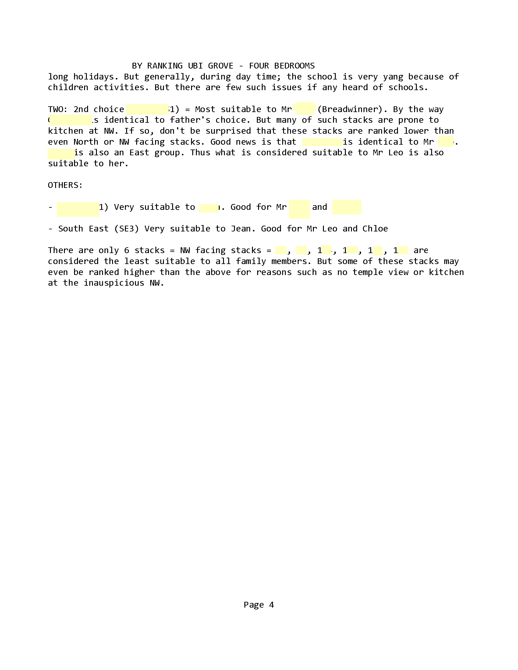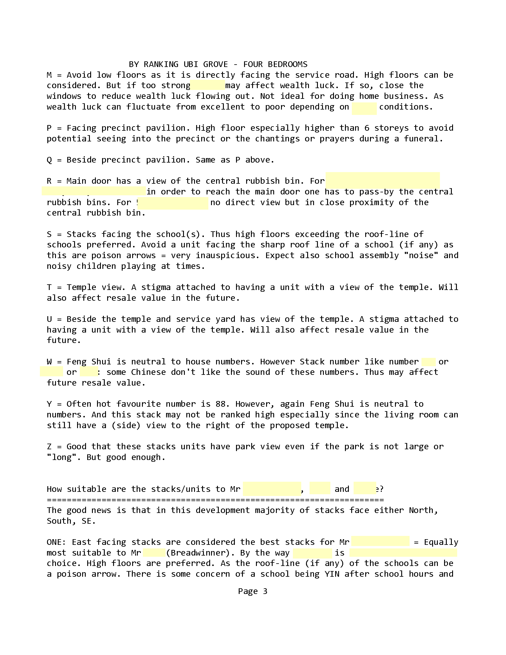 February 13, 20187 yr Author Staff Part 8 - Male Breadwinner and the concern of kitchen at NW sector 1. Do a search in this forum for " Fire at Heaven's Gate ". 2. Generally, a kitchen especially if a stove is directly at the NW cardinal point will be inauspicious for the male-head of the house. Typically this can affect him. 3. This is because NW under the Ba Gua Trigram belongs to the Heaven (sign). And NW also represents the male-head elder of the house. 4. Thus in simple terms: turning on a stove at NW will burn one's Heaven luck = not lucky and also may affect the male-head elder's career. 5. If you have done so many review as I have, even in a ranking exercise; I can pick out stacks/units in my mind that has this concern. And flag it to the potential purchaser. 6. Thus for this development HDB Ubi Grove, I randomly picked one example. Here, stacks 108 & 112 as shown below has the kitchen within the NW sector:- 7. Mind you, there are lots, lots more of similar stacks with kitchen at NW sector in HDB Ubi Grove = caveat emptor.. let the buyer beware! 8. Additional 4 bedroom type stacks with kitchen at NW: