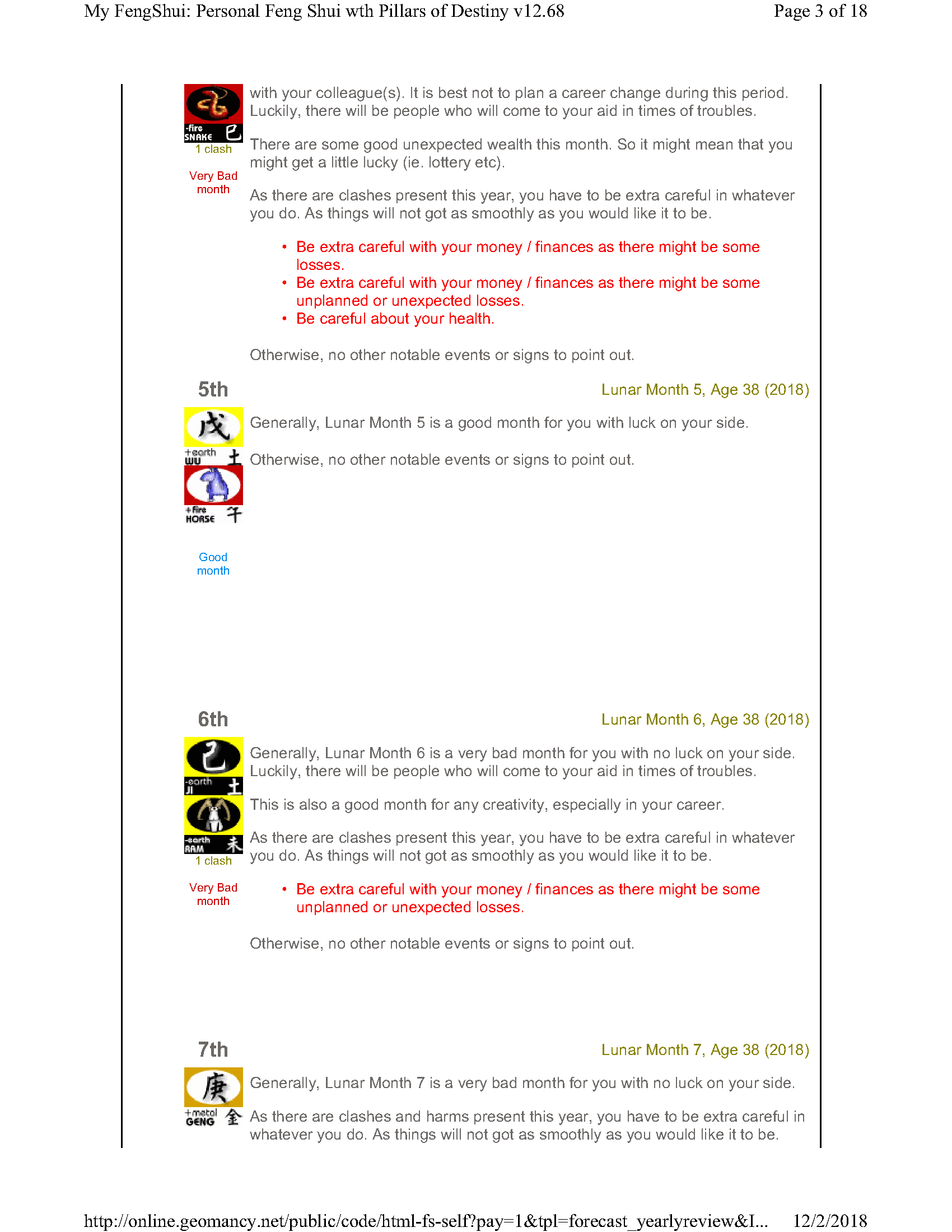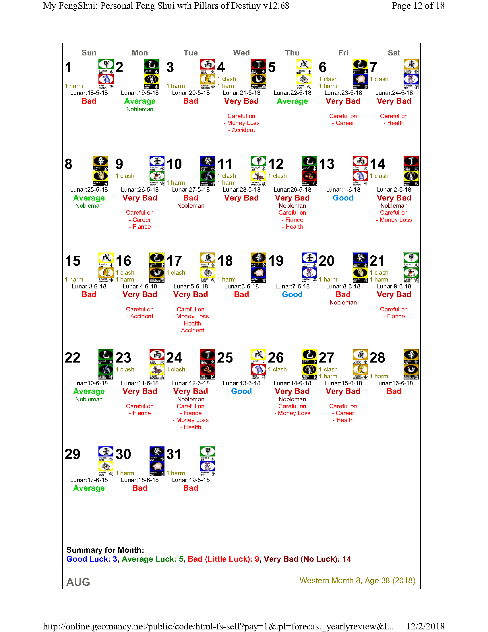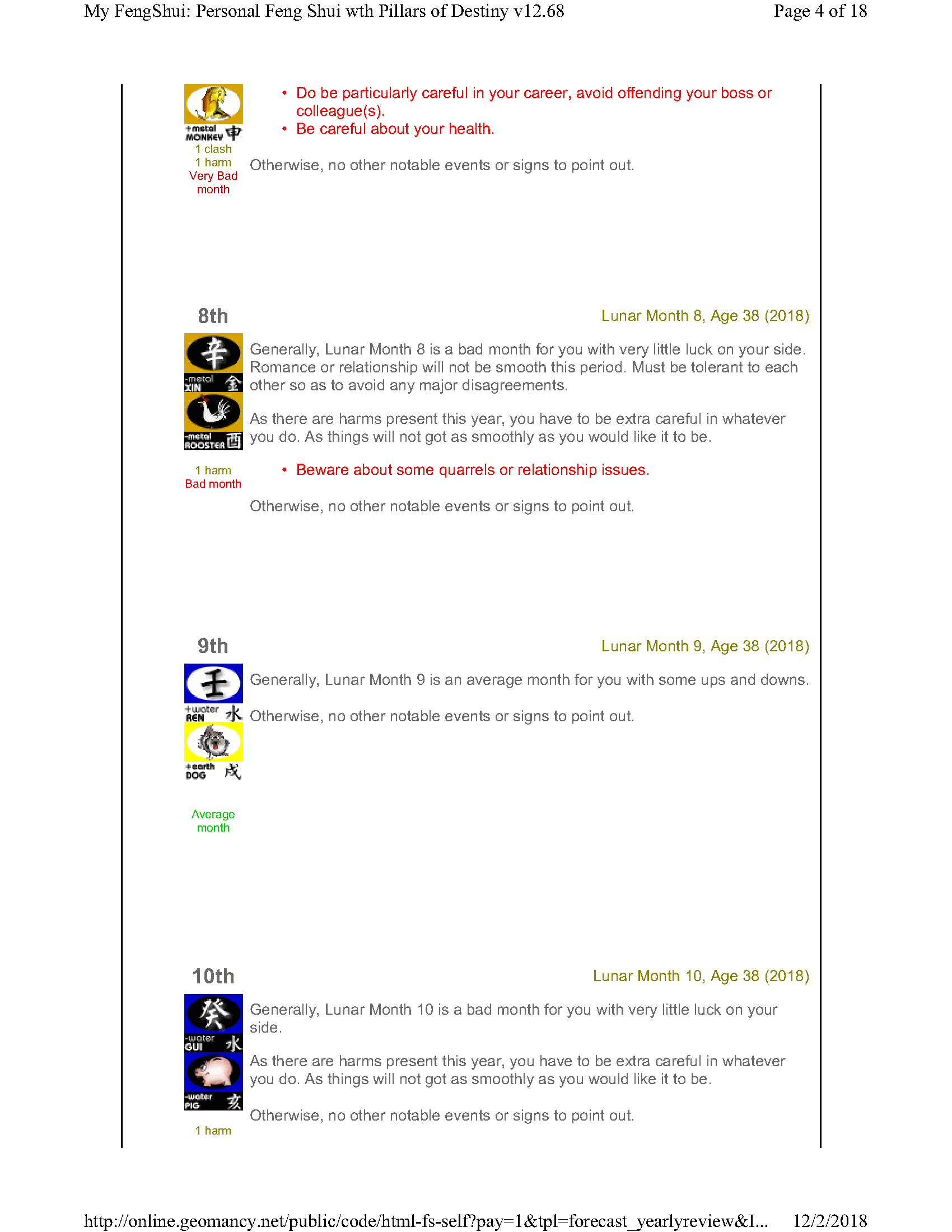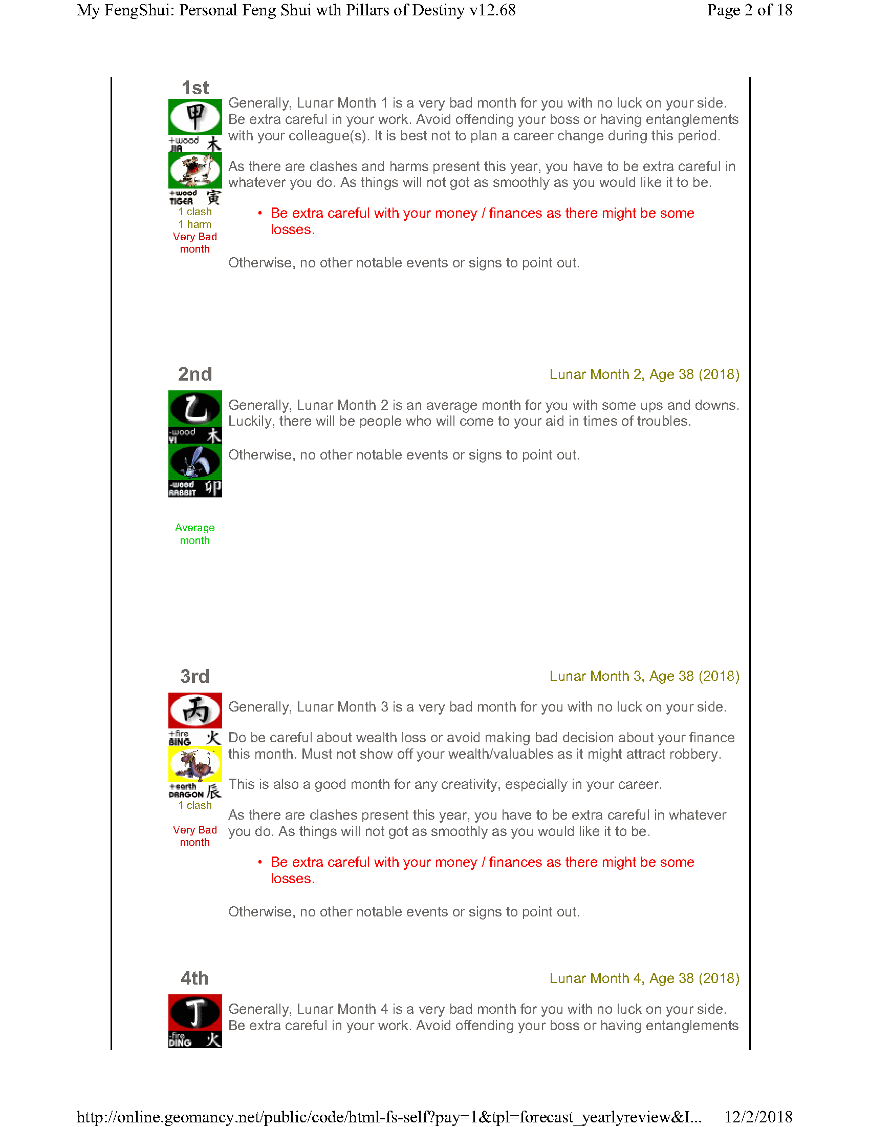 February 12, 20187 yr Author Staff Mr Ba Zi and highlights for the Year 2018 Summary of monthly expectations for Mr Ba Zi 1st lunar month: Be extra careful with money 2nd lunar month: Average to fair month 3rd lunar month: Be extra careful with money 4th lunar month: Be careful of money and health 5th lunar month: Good month 6th lunar month: Be extra careful with money 7th lunar month: Be careful with career and health 8th lunar month: Beware of quarrels and relationship issues 9th lunar month: Average to fair month 10th lunar month: Take care in whatever you do 11th lunar month: Beware of quarrels and relationship issues 12th lunar month: Average to fair month