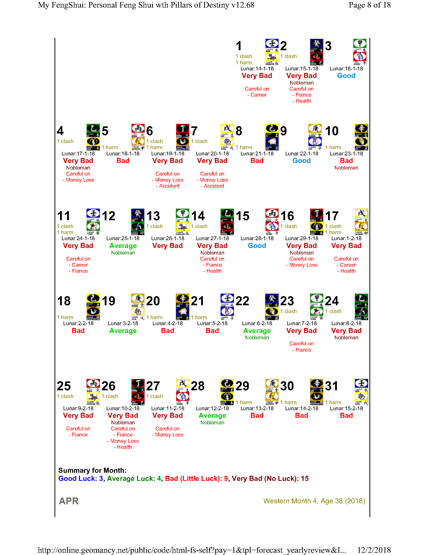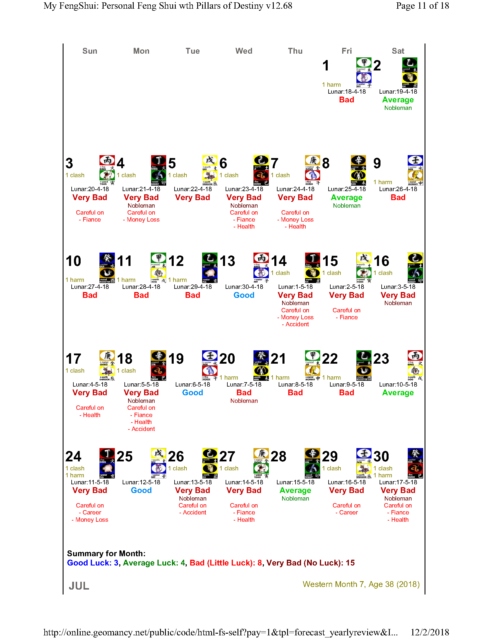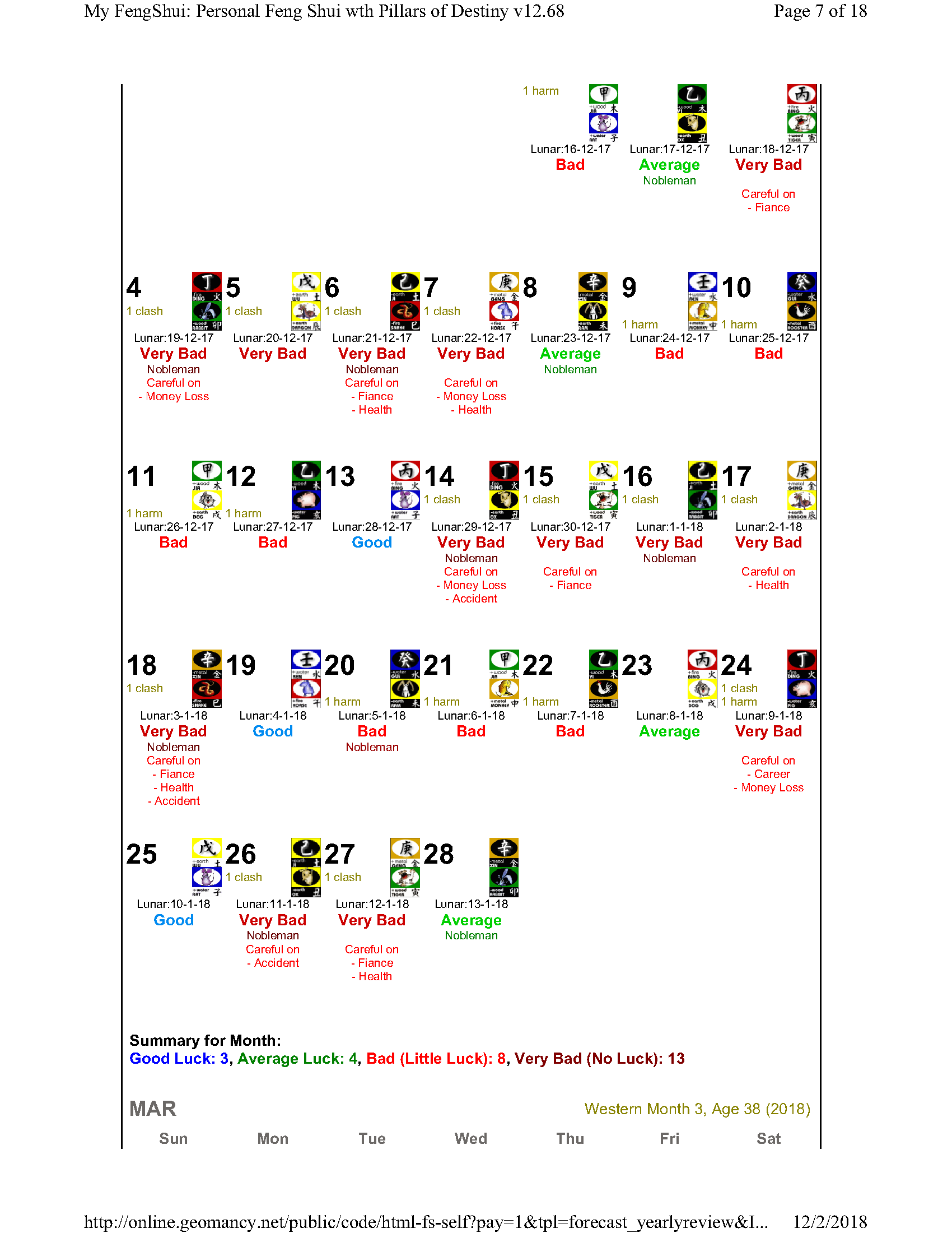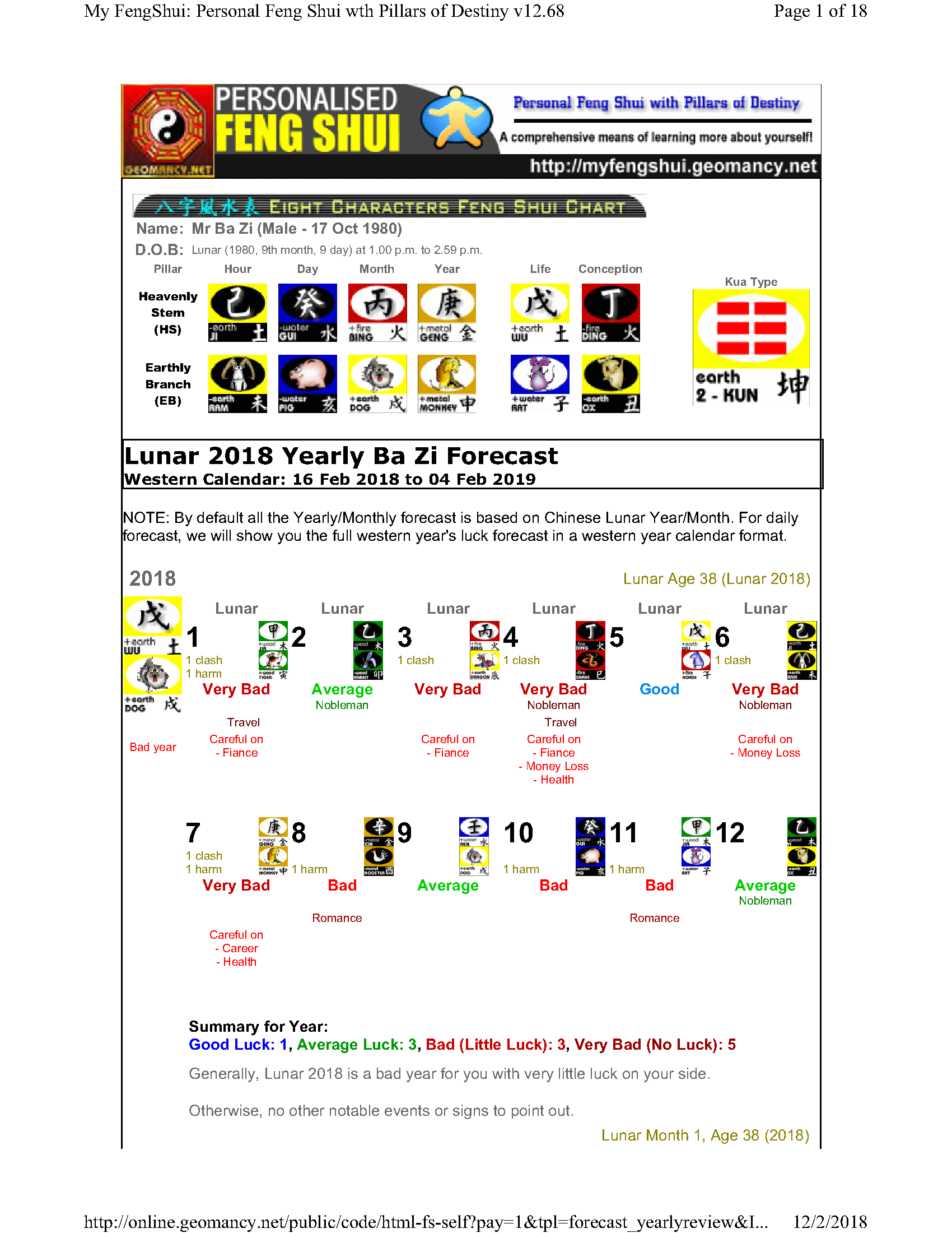 February 12, 20187 yr Author Staff Mr Ba Zi and highlights for the Year 2018 Summary of monthly expectations for Mr Ba Zi 1st lunar month: Be extra careful with money 2nd lunar month: Average to fair month 3rd lunar month: Be extra careful with money 4th lunar month: Be careful of money and health 5th lunar month: Good month 6th lunar month: Be extra careful with money 7th lunar month: Be careful with career and health 8th lunar month: Beware of quarrels and relationship issues 9th lunar month: Average to fair month 10th lunar month: Take care in whatever you do 11th lunar month: Beware of quarrels and relationship issues 12th lunar month: Average to fair month