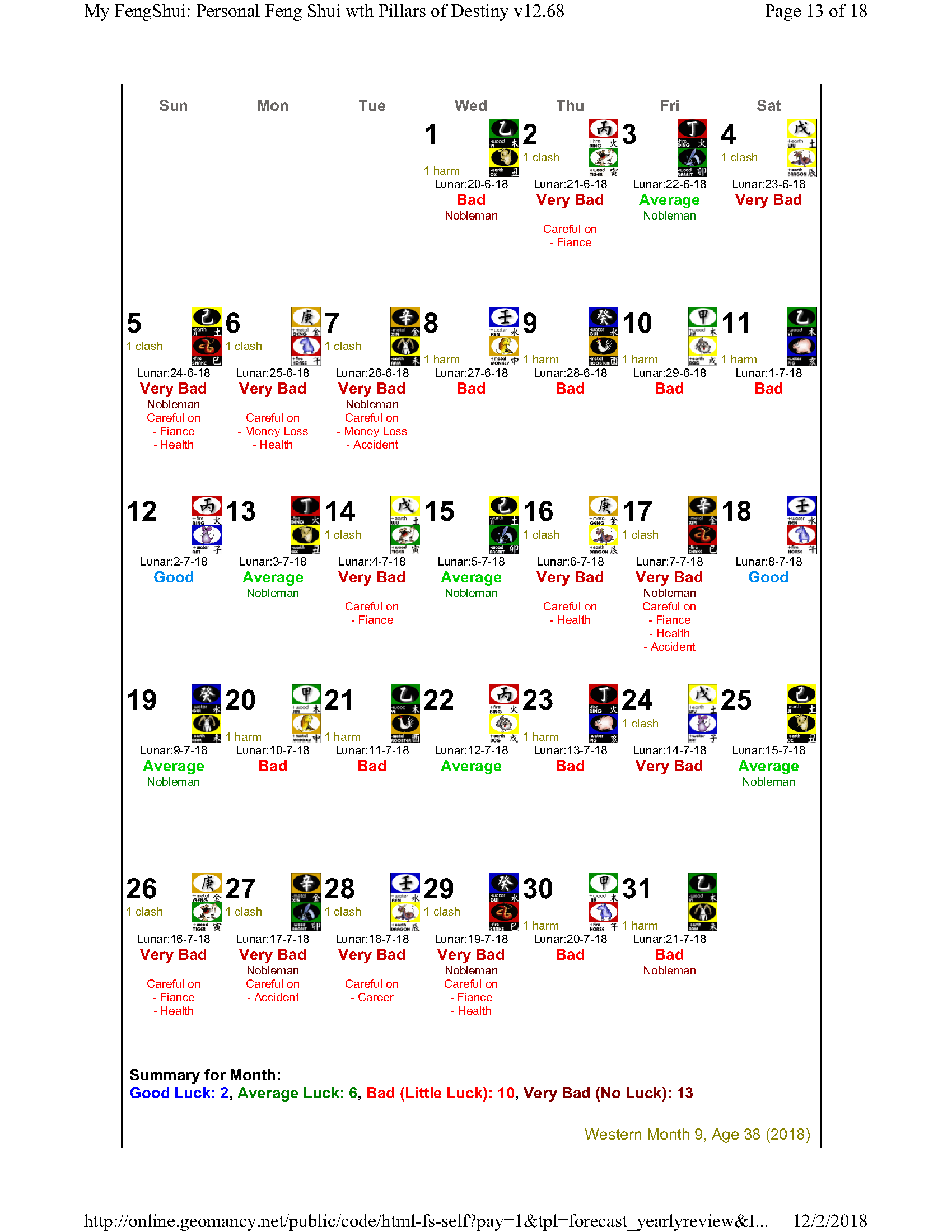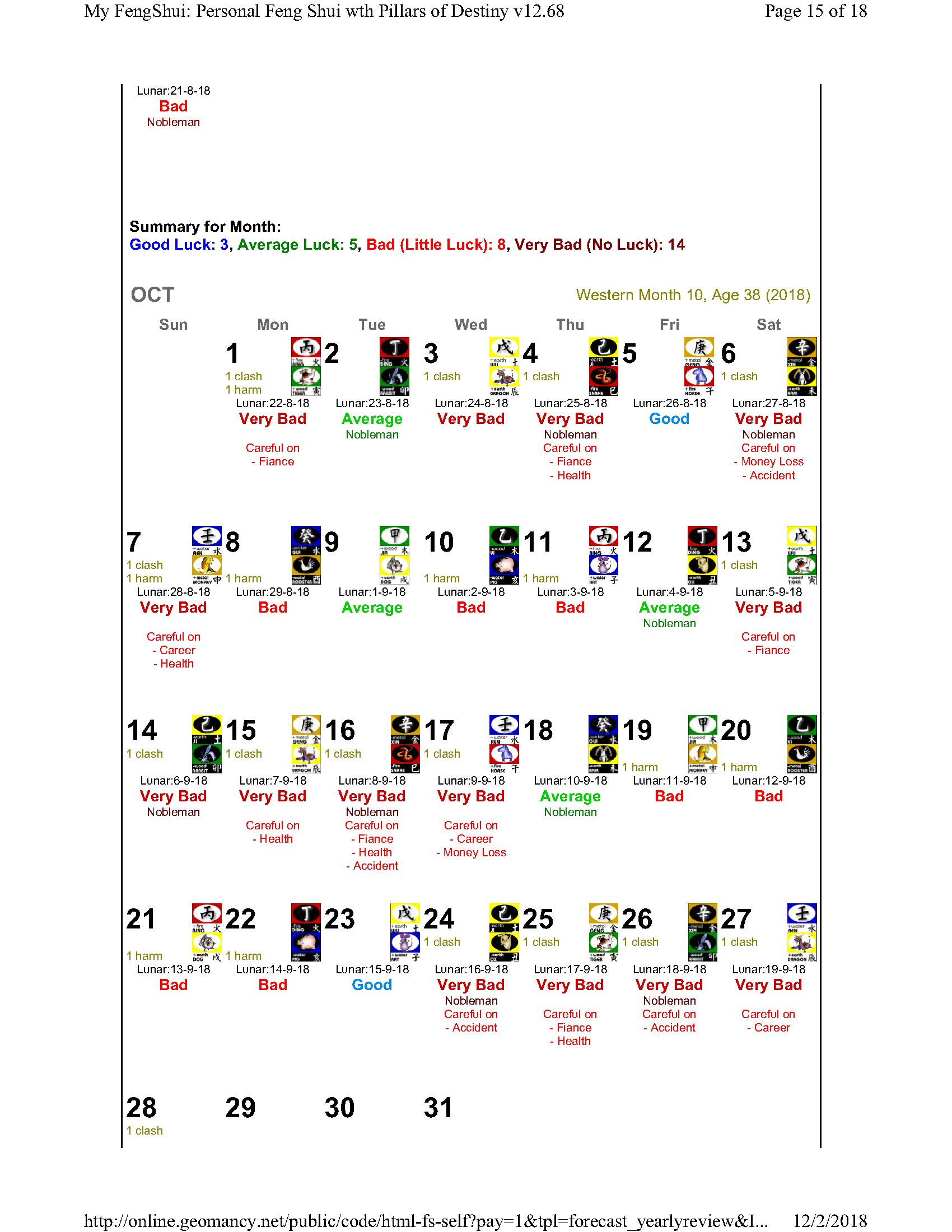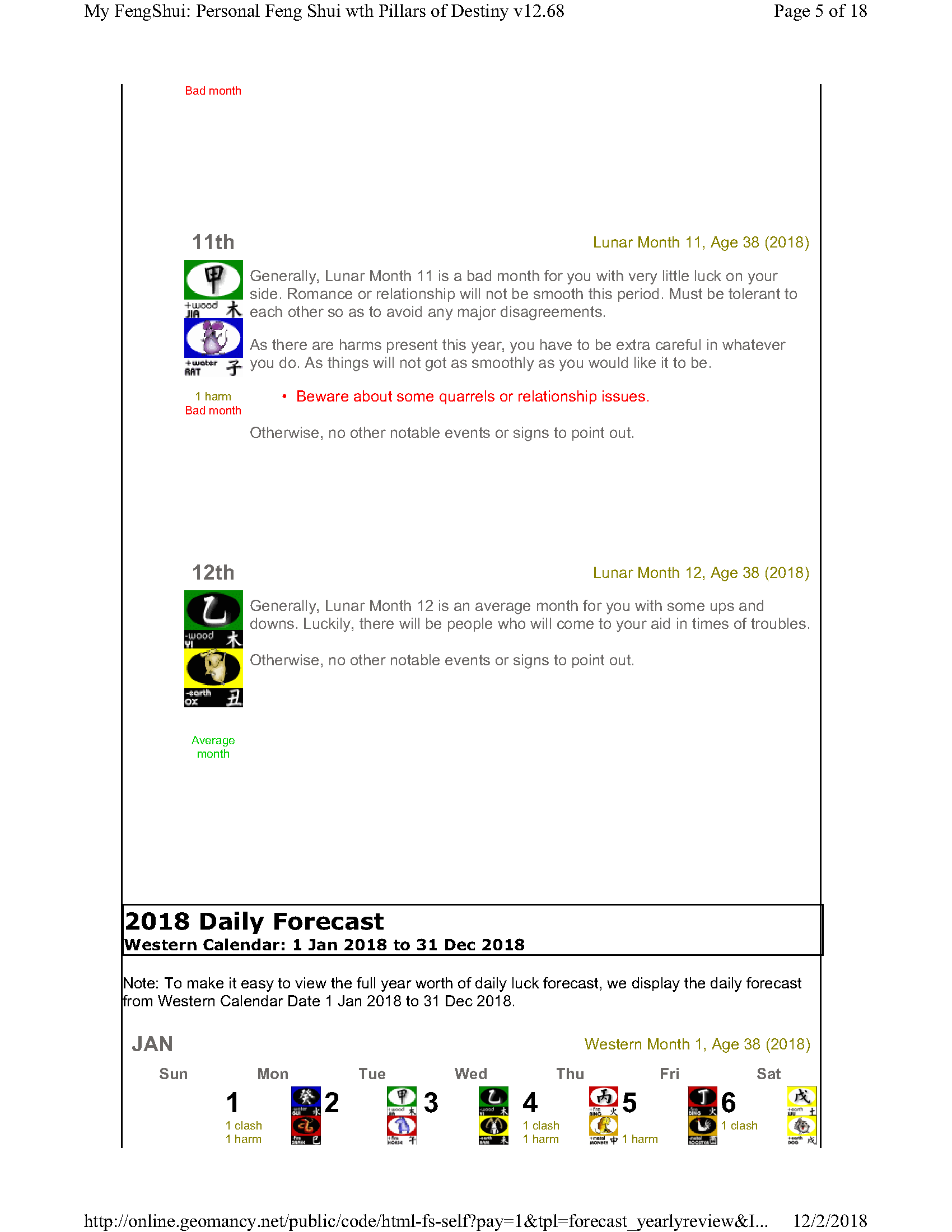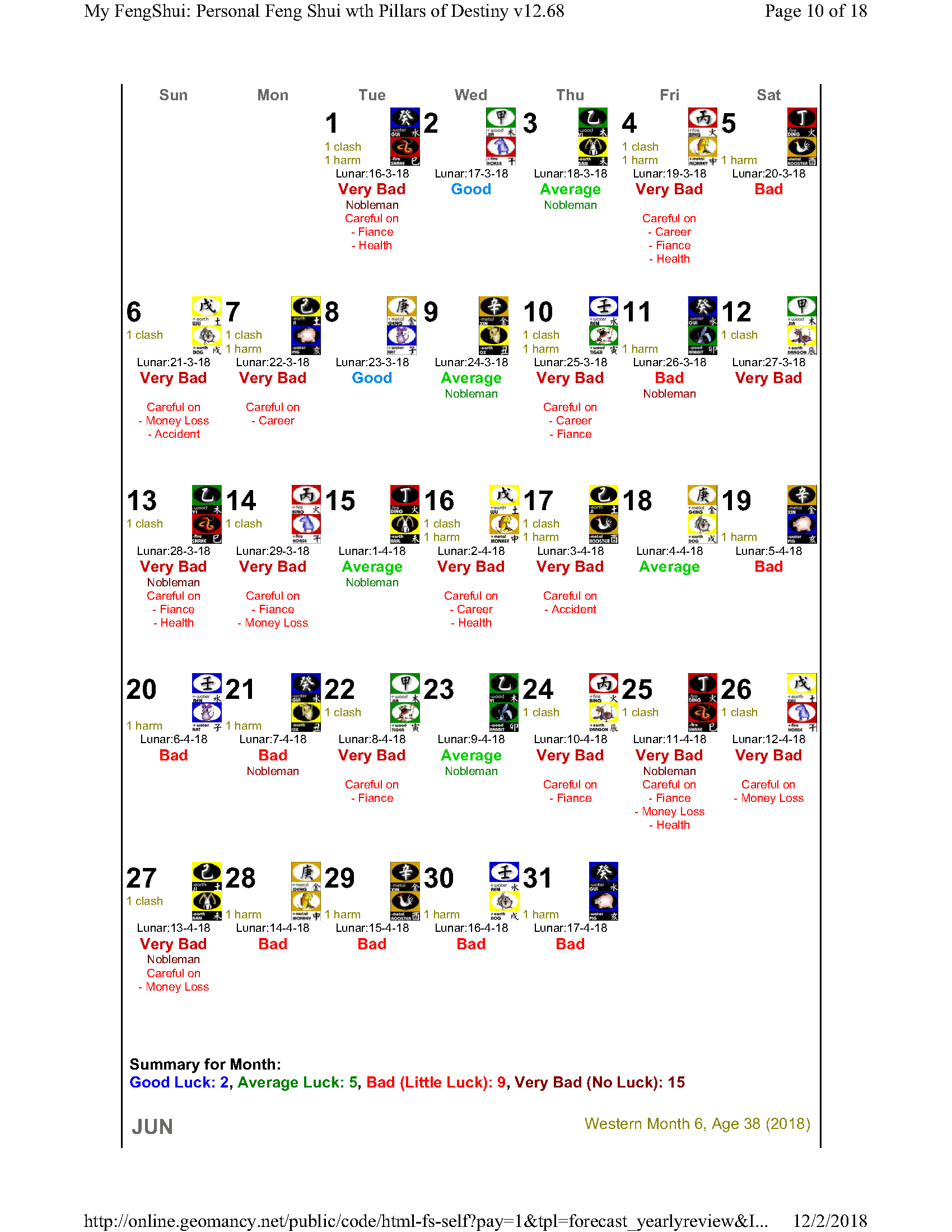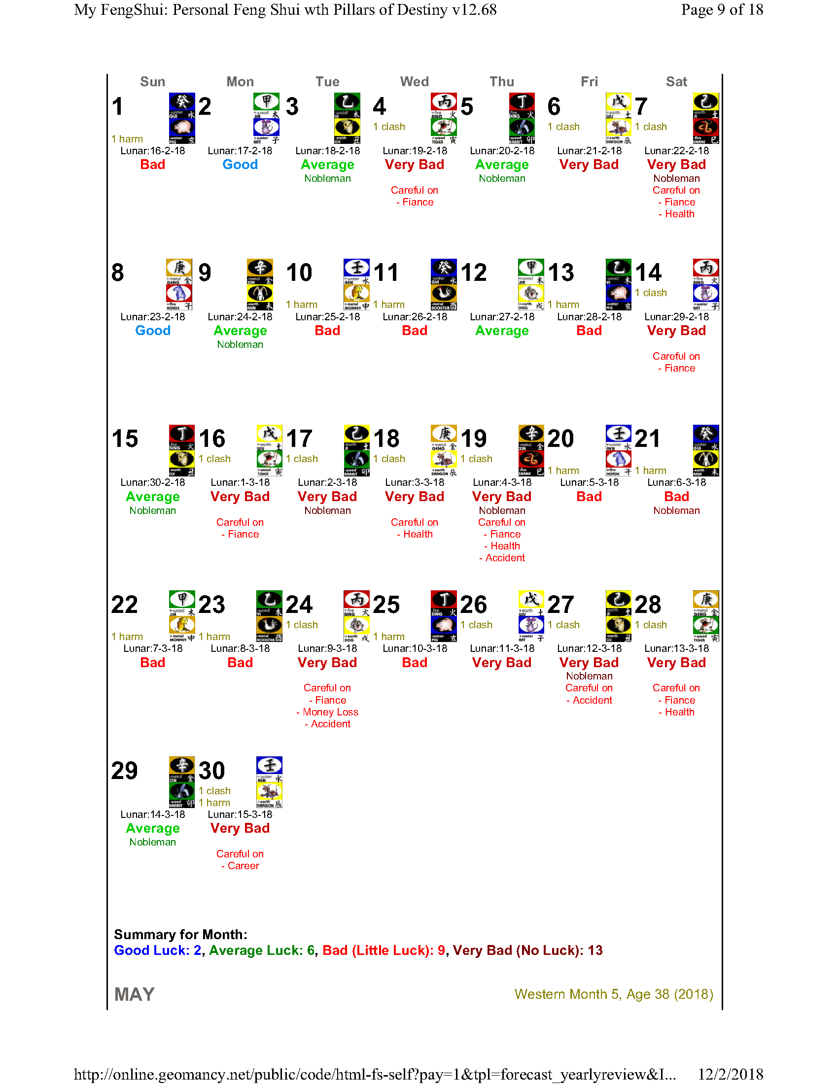 February 12, 20187 yr Author Staff Mr Ba Zi and highlights for the Year 2018 Summary of monthly expectations for Mr Ba Zi 1st lunar month: Be extra careful with money 2nd lunar month: Average to fair month 3rd lunar month: Be extra careful with money 4th lunar month: Be careful of money and health 5th lunar month: Good month 6th lunar month: Be extra careful with money 7th lunar month: Be careful with career and health 8th lunar month: Beware of quarrels and relationship issues 9th lunar month: Average to fair month 10th lunar month: Take care in whatever you do 11th lunar month: Beware of quarrels and relationship issues 12th lunar month: Average to fair month