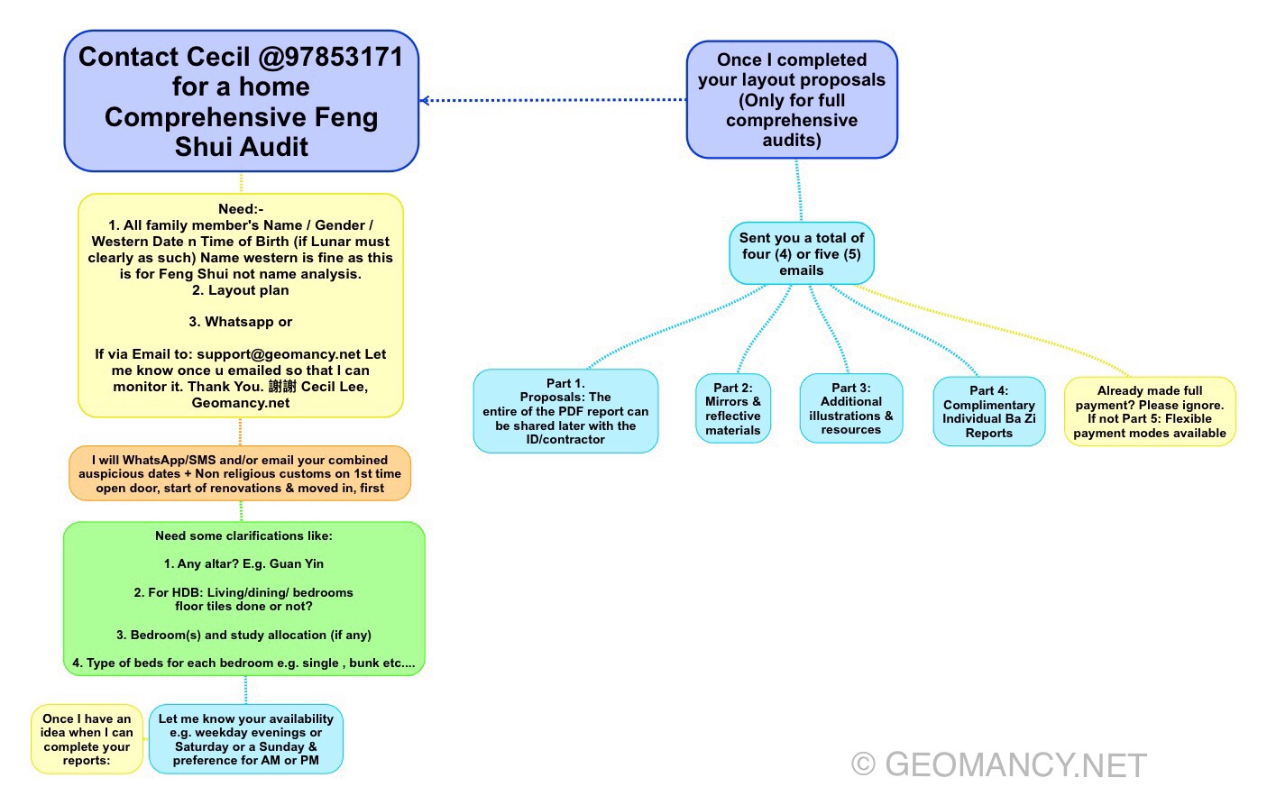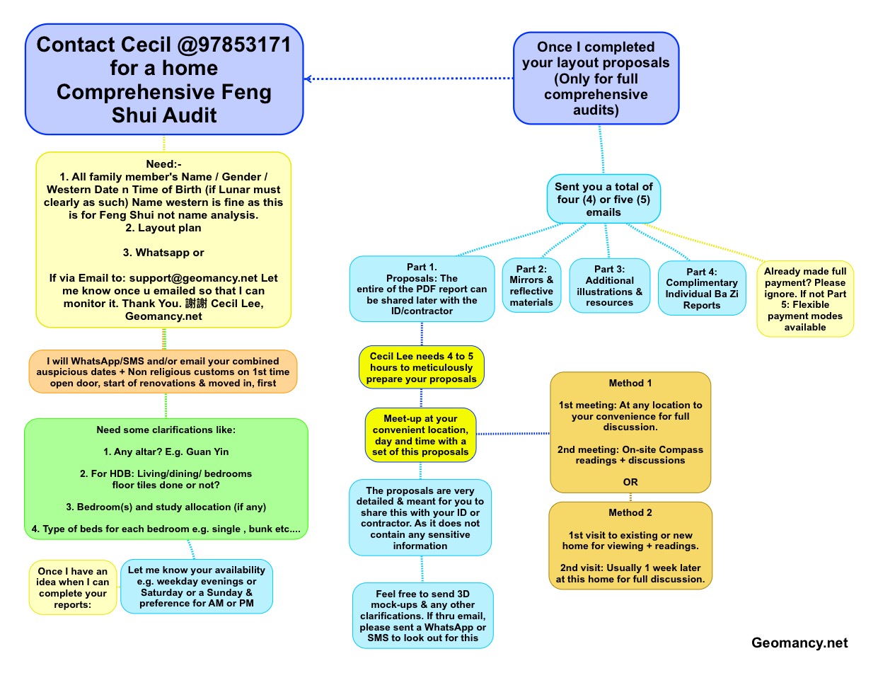 March 15, 20187 yr Author Staff Flow chart for a home comprehensive Feng Shui. Contact Cecil Lee @ 97853171 This version is more detailed version