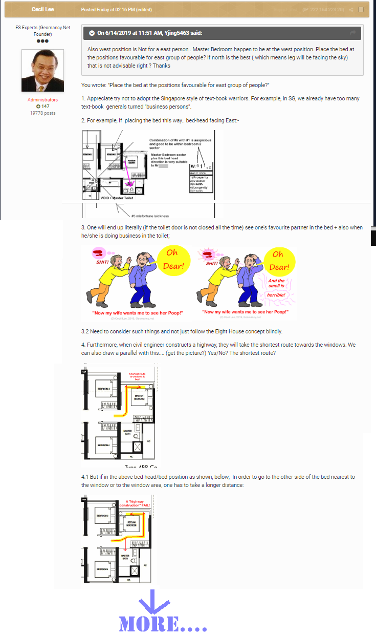 June 17, 20196 yr Author Staff 4 hours ago, MariTere said: I'm a West Person so I just purchased a home and my main door faces East! But my garage door is the West... Now my master bedroom am I suppose to face West or my Headboard suppose to be on the West? Confusing.. Thank you, Maria Honestly, there are more than meets the eye under Holistic Feng Shui. 1. How to apply sleeping and work positions. 1.1. Under this link, the Flying Star Feng Shui, the general bedroom layout is taken into real consideration:- 2. Also, in a real world there are many say married couples who have partners where one is east group and the other west group persons. 2.1 Thus it is not like a couple: one west and the other east group persons: "need to wash their legs close to sleeping time." And one partner sleeps with the other's legs and vice-versa if they need to face their best bed-head directions. (If any) 3. All too often questions like these looks simple enough: "Now my master bedroom am I suppose to face West or my Headboard suppose to be on the West?" 3.1. Frankly, there are lots more considerations: as considerations include the bedroom layout, where are the openings such as windows, bedroom door, toilet doors etc... 4. Try to avoid this type of Feng Shui:- 4.1. Simply called : "Fast Food Feng Shui." 4.2. Please excuse this graphic. And IGNORE the word "CRAZY". 4.2.1 As your posting is certainly not "CRAZY" but understandable. Just that I do not want to re-edit this caricature. 4.3. But it is useful to bring it up to illustrate the term: "Fast Food Feng Shui" that's all! 4.4. Thus, your posting is understandably not crazy. LOL 5. Just a few days ago, something similar was asked.... 5.1. I took a snap shot of that resource: 5.2 The actual write-up is in this link... Please scroll to Part 15 under Parc Botannia, below: 5.3. The question seems so simple.... yet ... many factors are taken into consideration.