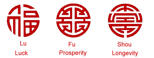 Posted January 8, 200025 yr Staff The attached picture shows the design of:Fu - LuckLu - Prosperity (Wealth) or God of WealthShou - Longevity (Health)These designs are usually found on the figures of each of these statues i.e. their clothings.