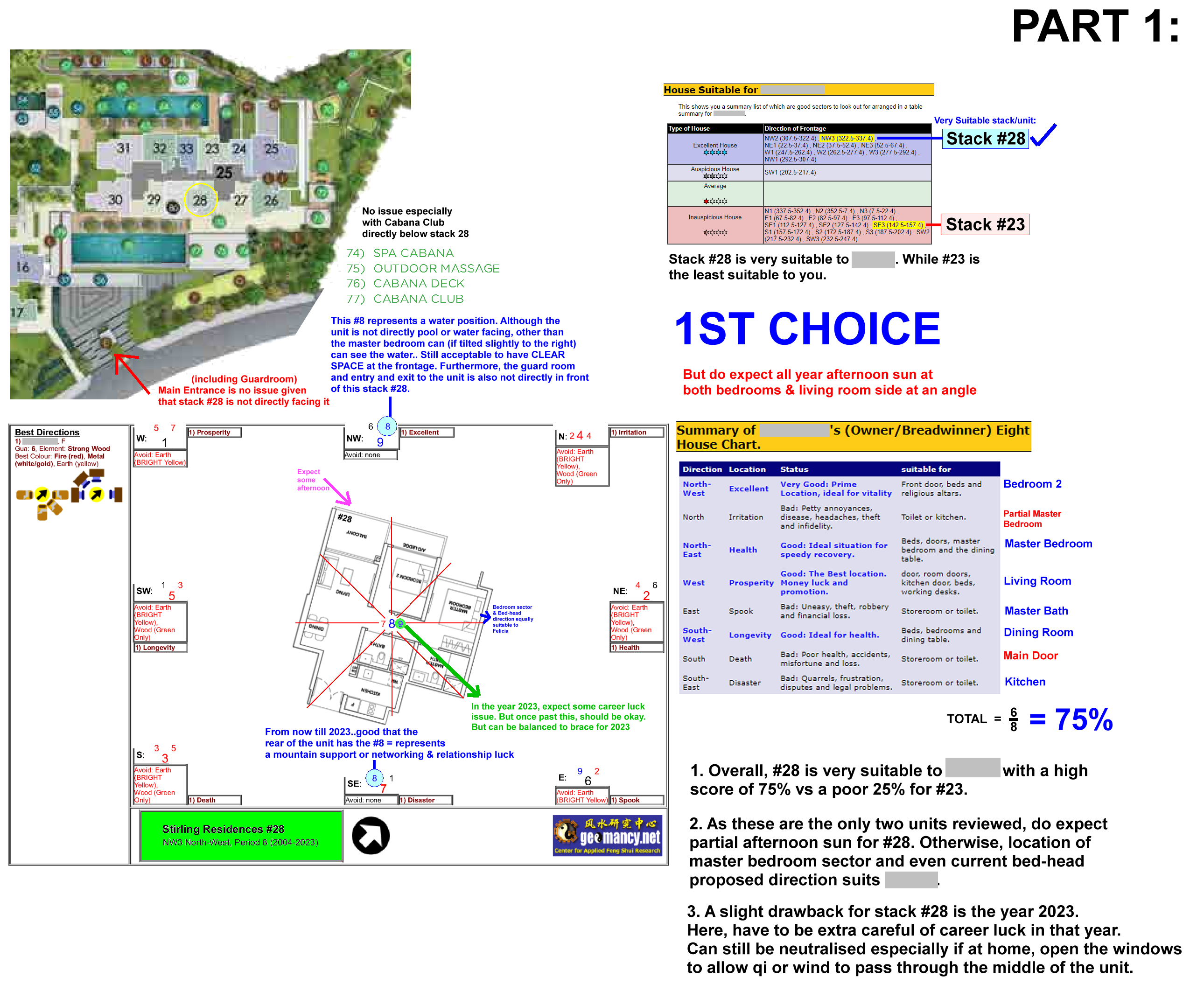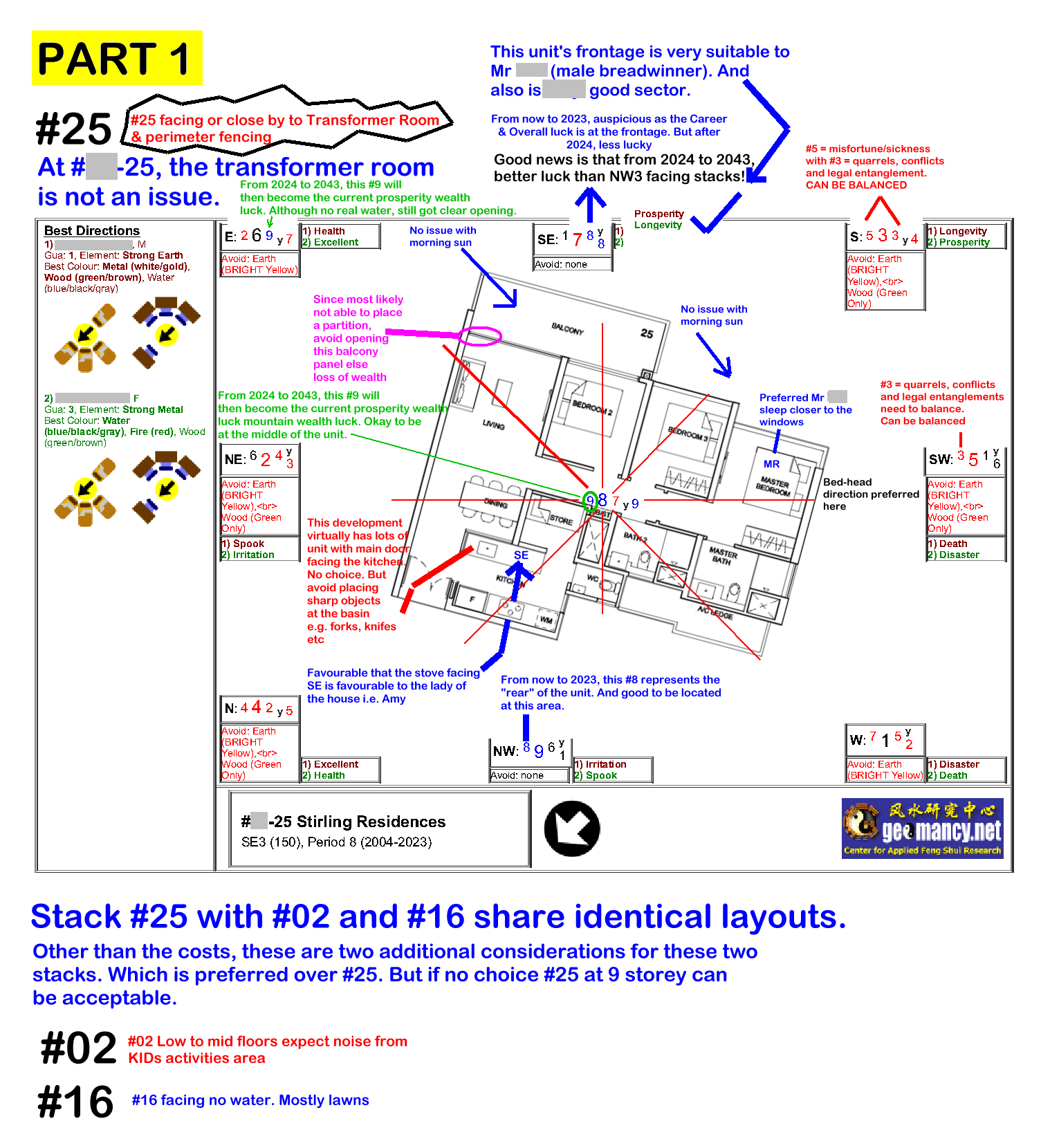 August 23, 20187 yr Author Staff On 8/22/2018 at 12:09 AM, ausbee said: Sorry Master Lee, I read through the forum. I extend the sides and got a rectangle before finding the centrepoint Then I tried to draw out the different sectors using the Compass North. This is my first attempt drawing, hope is correct. Appreciate your help to advise a newbie on the following. 1) May I know how do we determine if the main door is in North Sector or NE sector since the door lies in both sectors? 2) Part of the stove seems to be slightly at the NW sector, do we determine that as fire at heaven's gate? 3) Do we call this a SE facing taking the balcony side as the side where the light comes in? Is drawing the 9 grid easier to see the sectors compare to that I draw? Appreciate your guidance. Stirling Stack 16.pdf Sample centrepoint. Can follow these examples. Frankly, with the centrepoint, and since all stacks in this development are either NW3 =335 degrees or SE3 = 155 degrees, get a protractor and plot it out. If really cannot, get a family member to do it - if one is very poor in this cognitive area. This area is not Feng Shui. In fact, more to do with common sense. Stack 16 is here:- Actual reviews by ranking will most likely not be released in the forum in the future. This is just one small section of a detailed Can or cannot buy review:-