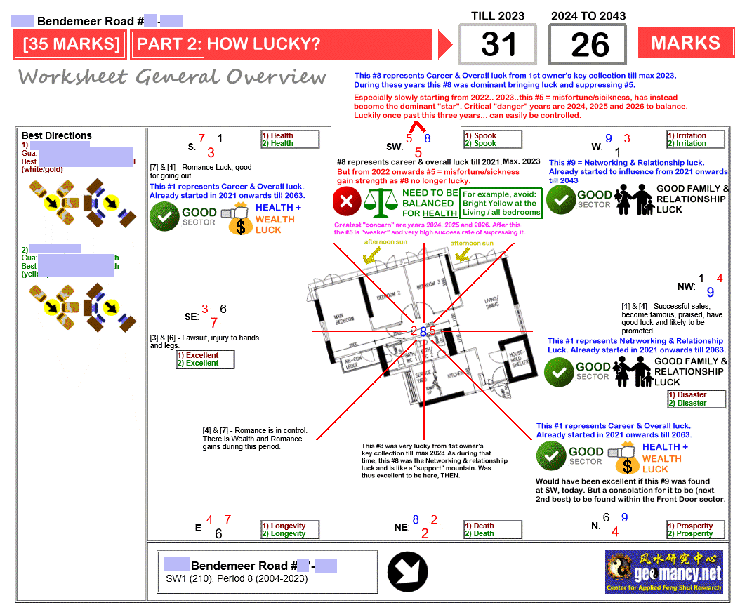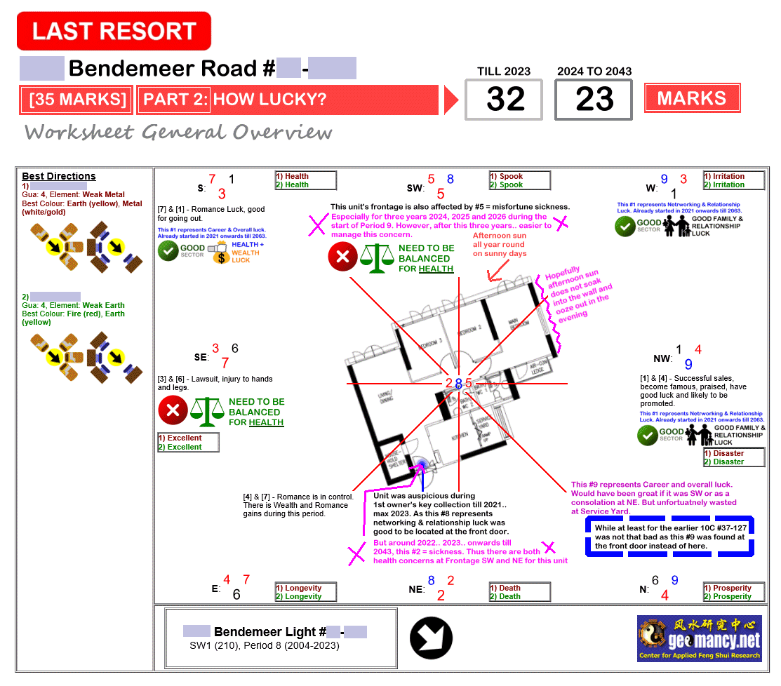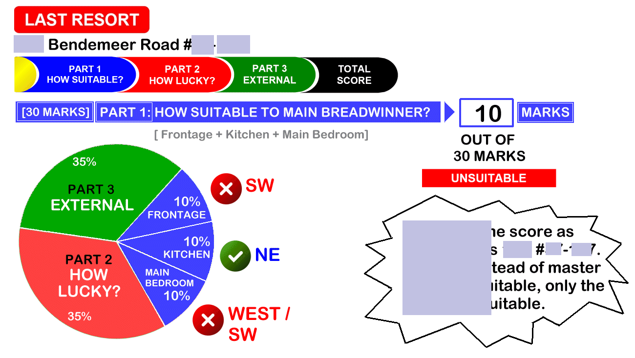 June 7, 20232 yr Author Staff How Suitable is the Unit? Page 1 of 3 = How suitable is the unit - Frontage, Kitchen & Main Bedroom? [30 marks] Page 2 of 3 = How is the luck of the Interior Feng Shui of this unit? [35 marks] Page 3 of 3 = External Feng Shui luck? [35 marks] + Overall score/grade [Total = 100 marks]. Sample 1: This Stack at HDB Bendemeer Light has health concerns, today
