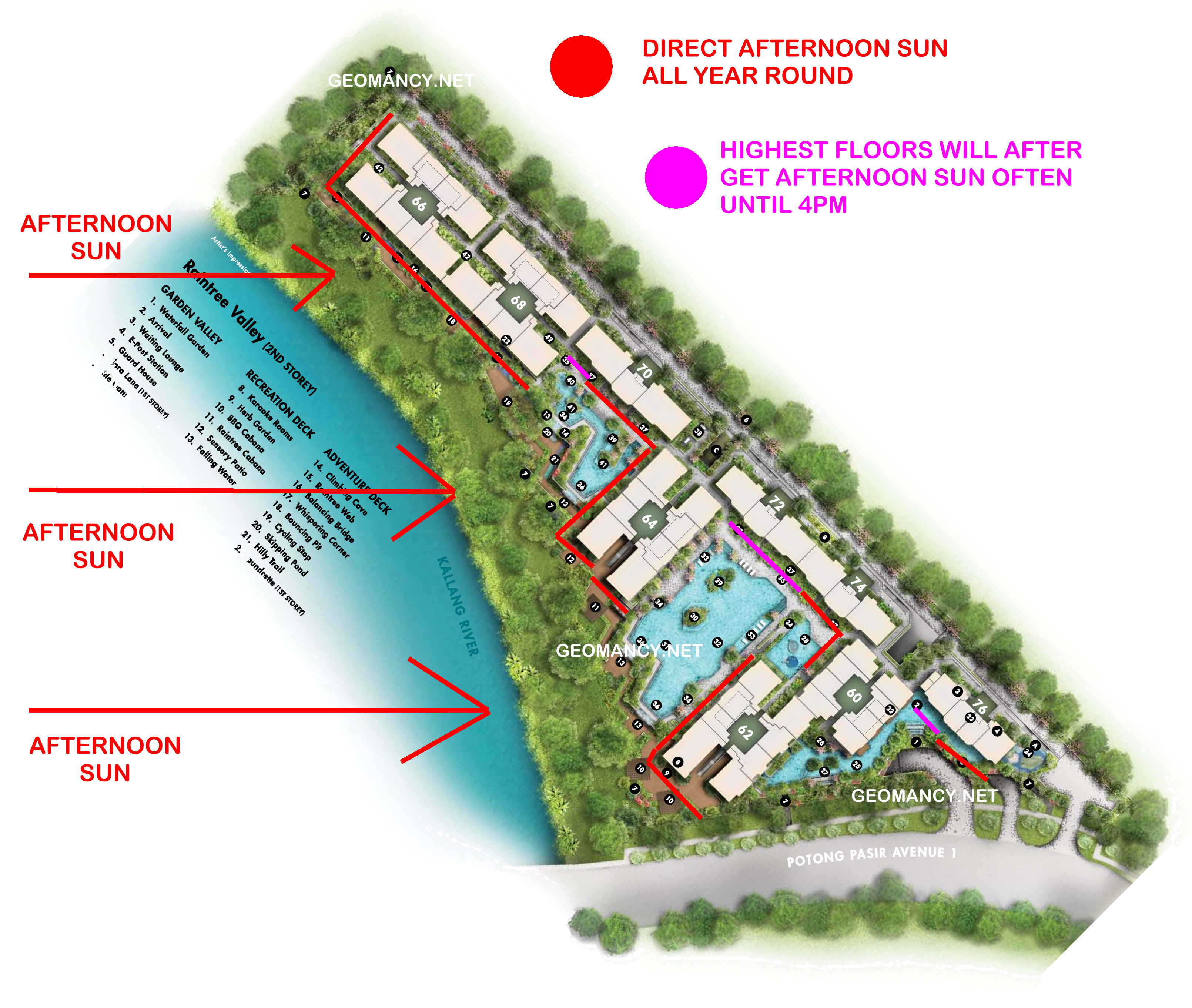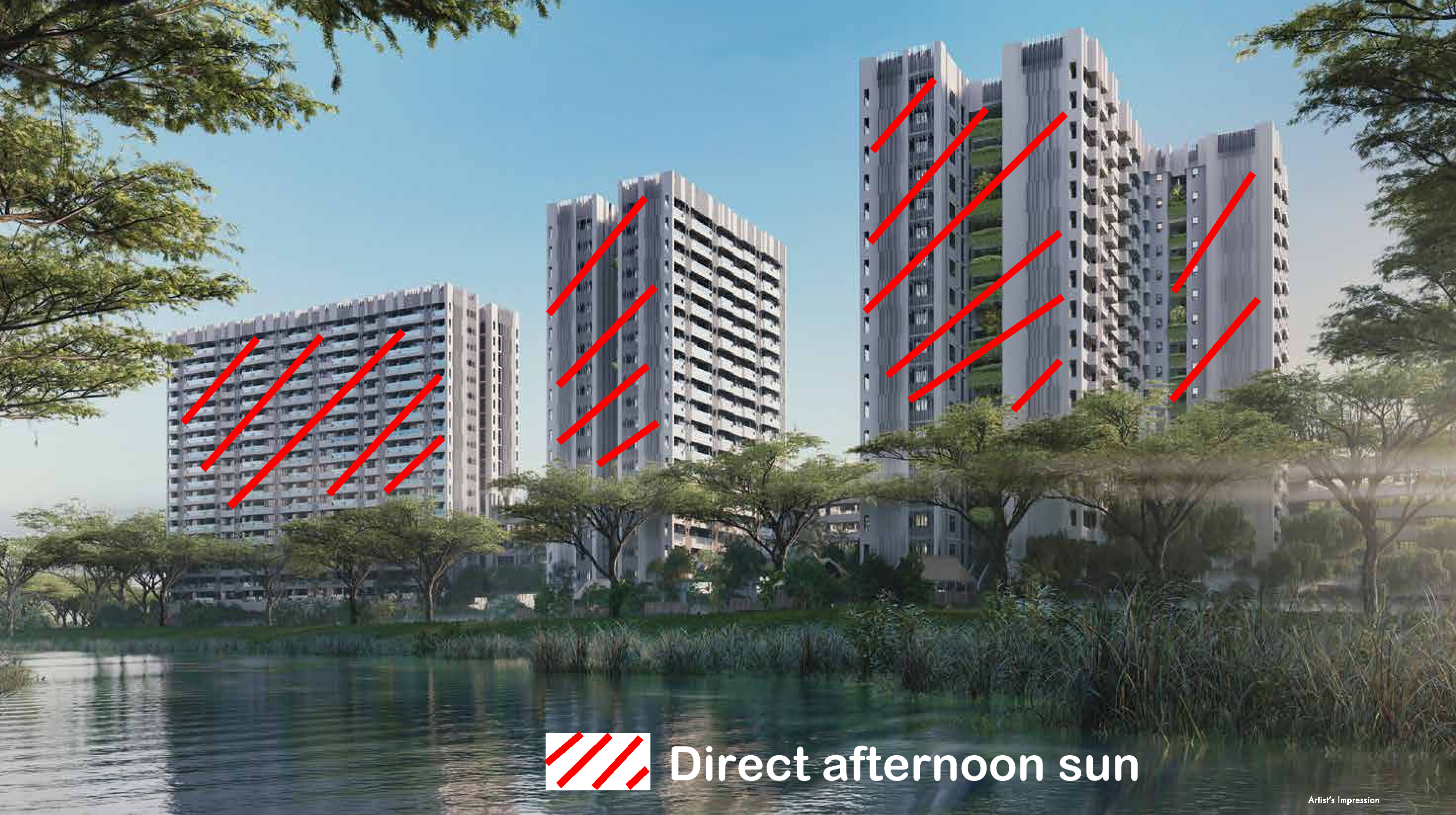June 21, 20196 yr Author Staff Part 6: Can I tell the afternoon sun just by looking at the Sales Brochure? 1. If one has a rough sense of the orientation of the development, one can roughly look at a Sales Brochure for clues. 2. In this example, we get to see the perspective of the development roughly from the river view. 3. I have added red stripes to the surface areas of the development where potentially these areas will receive close to direct afternoon sun ... all year round... and no running away from it. 4. Nothing beats taking the site plan; orientate the site plan with the North compass correctly at the TOP and outline the areas that can be affected by afternoon sun:-