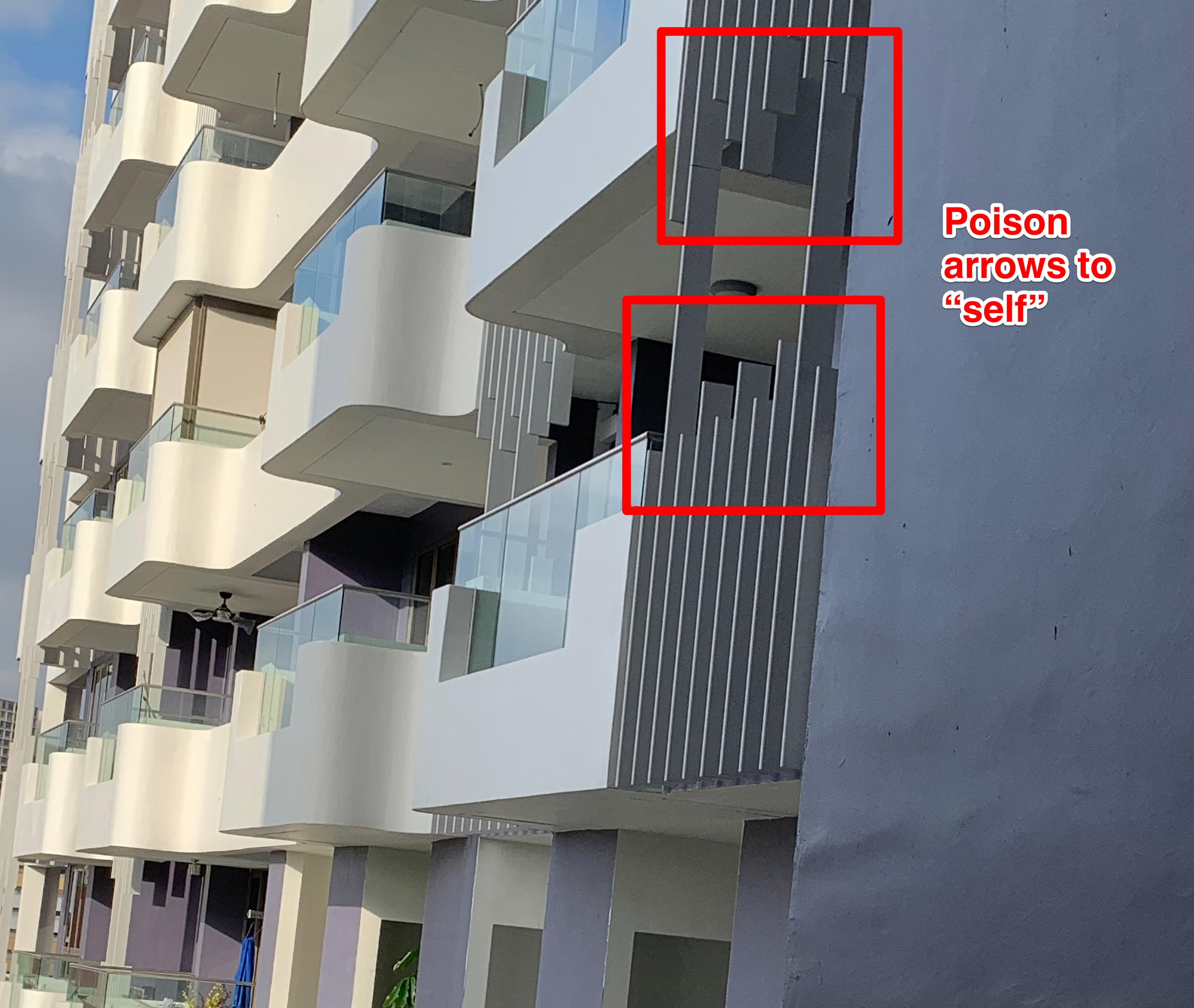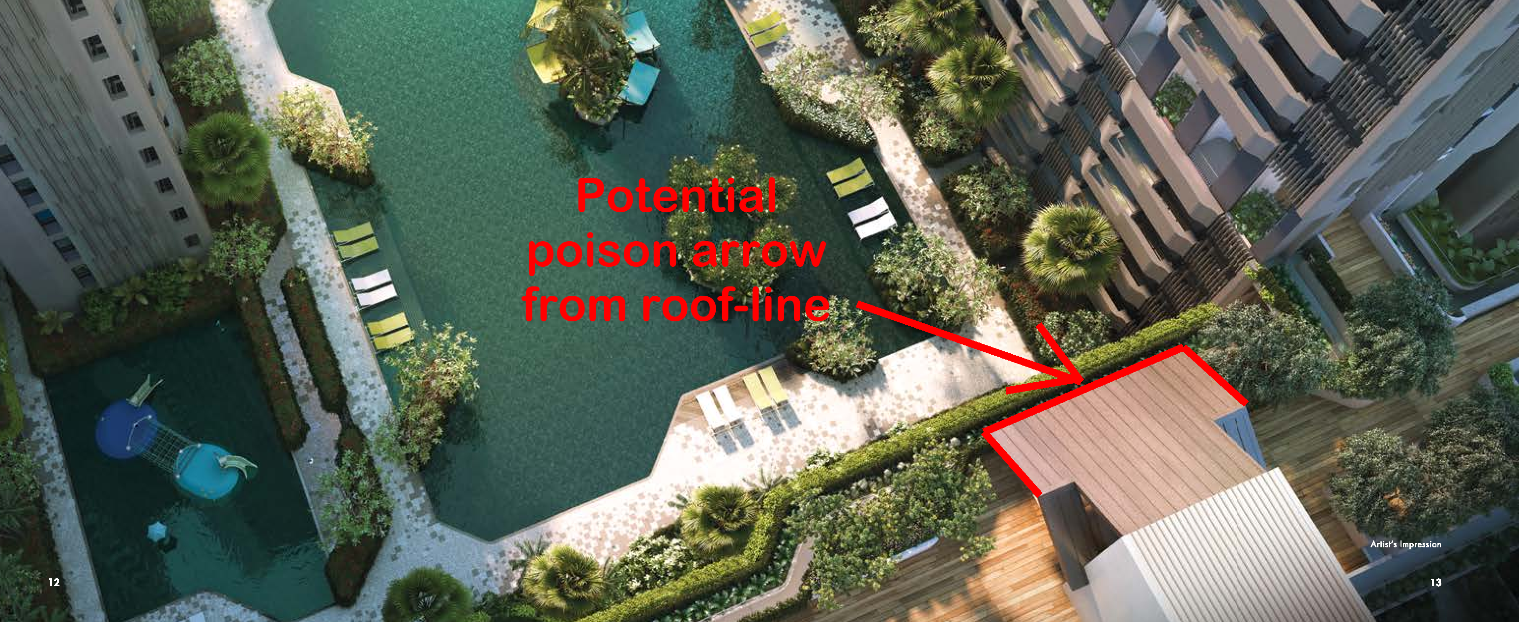 June 21, 20196 yr Author Staff Part 5: Case Study - Potential poison arrow as shown by the two "X's 1. Oh dear... don't tell me... a "geniuine" not fake... poison arrow... 2. Often, clues of poison arrow(s) is visible from the Sales Brochure.. provided one knows of it's possible existence... 3. Do pay extra attention to structures especially roof-lines of club-house and or other utility buildings near to one's potential unit of purchase: 4. For now, this not possible: 4.1 But can't you visualise? Or one of the best visual tools (not fool proof) is look closely at the developer's showroom model and zoom into the area /level stack/unit that one is looking at...