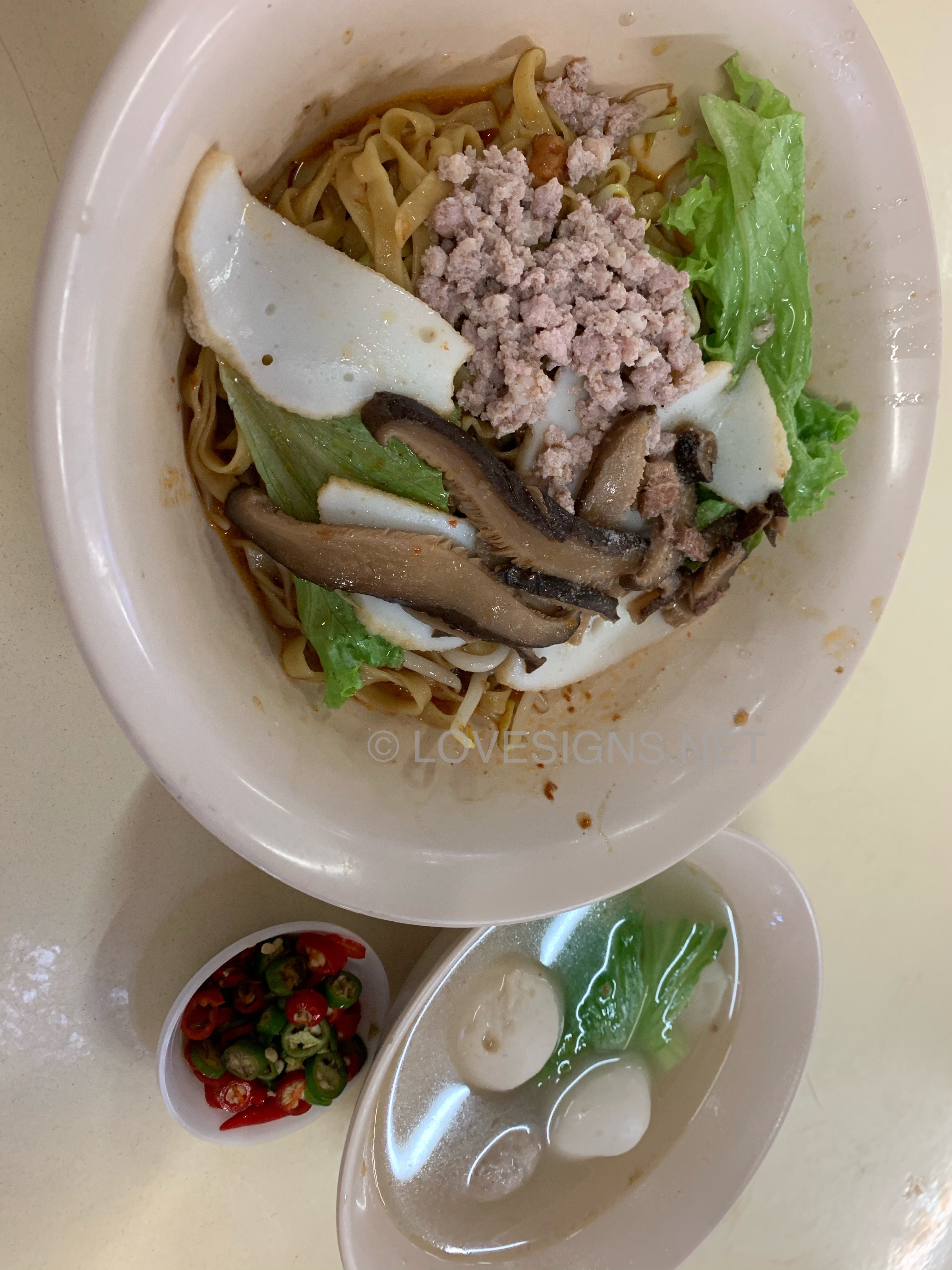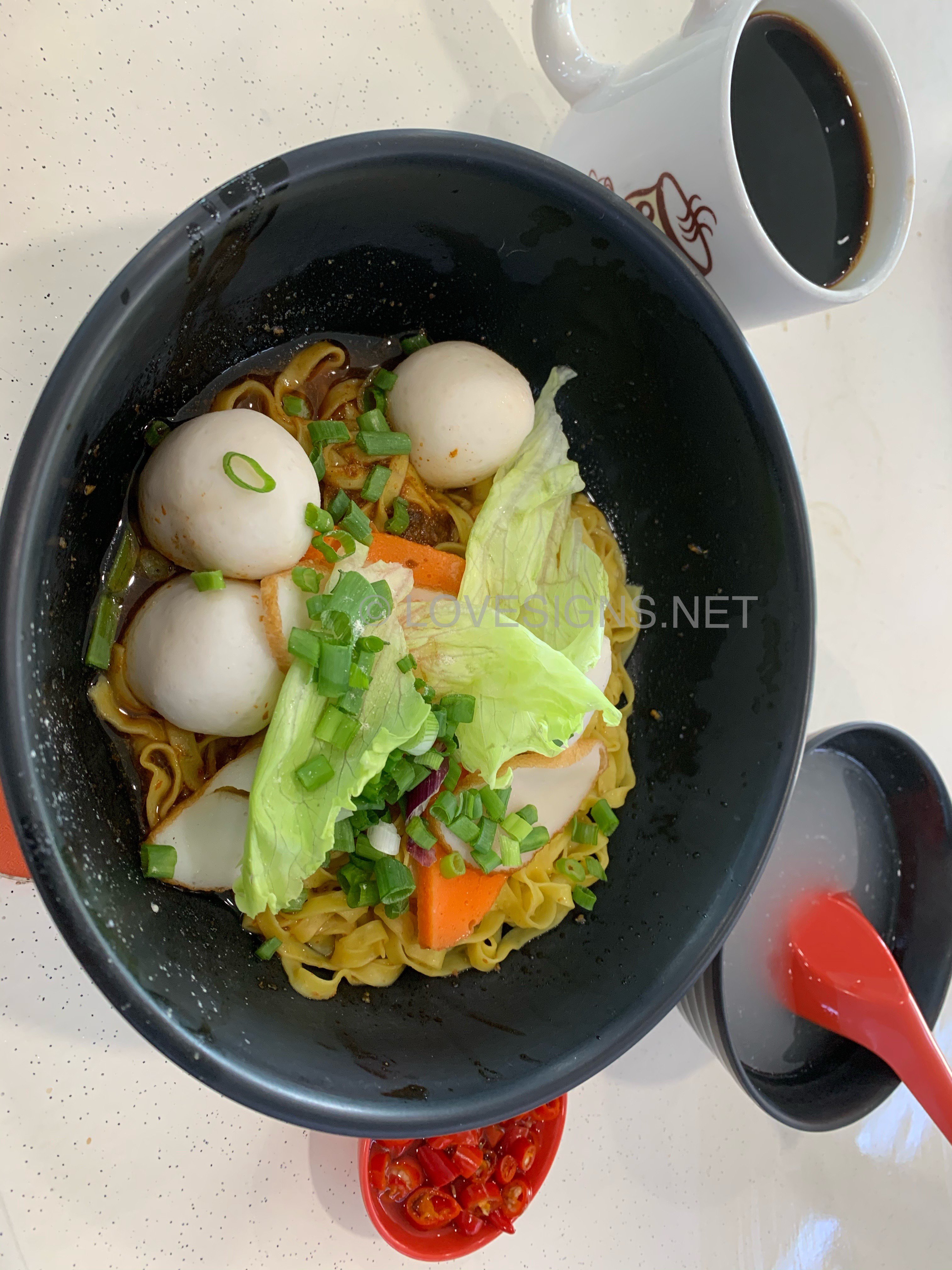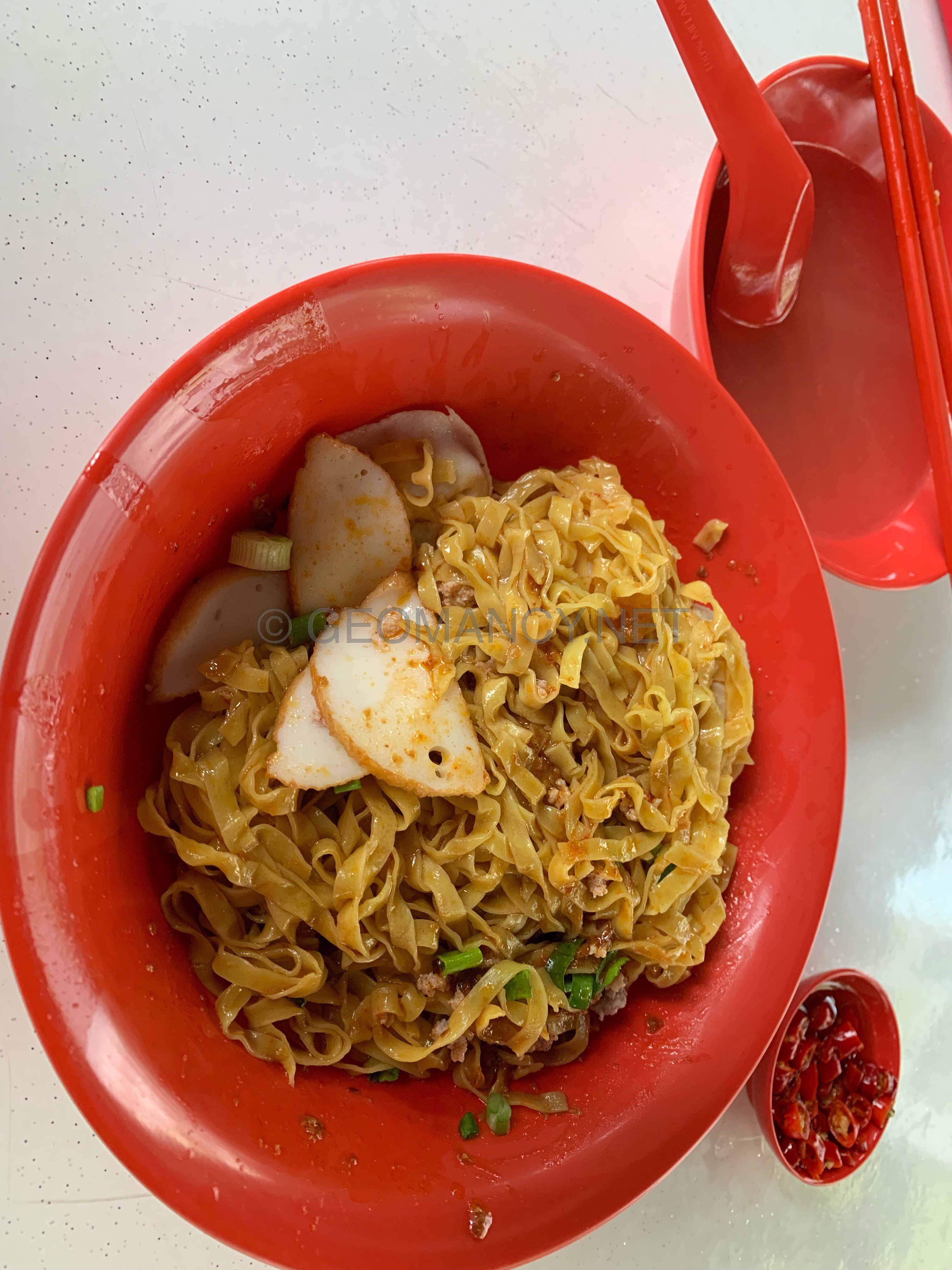 January 6, 20206 yr Author Staff 1. Yong Seng Teochew Mee at Block 105 #02-47 Hougang Avenue 1 Market/Food Centre. 2. Probably the best that I ever tasted! At $4/- basic bowl. 3. Generous amounts of chilli. Sauce well balanced. Very unique fine (flat) noodles...chewy, not sticky. But no fish maw found in the $4/- bowl... Did not order their Laksa, although seen someone buying it. Looks nice. But too unhealthy for me... Another popular stall is also on the same facing and level. Nearby to the open air wash basins.