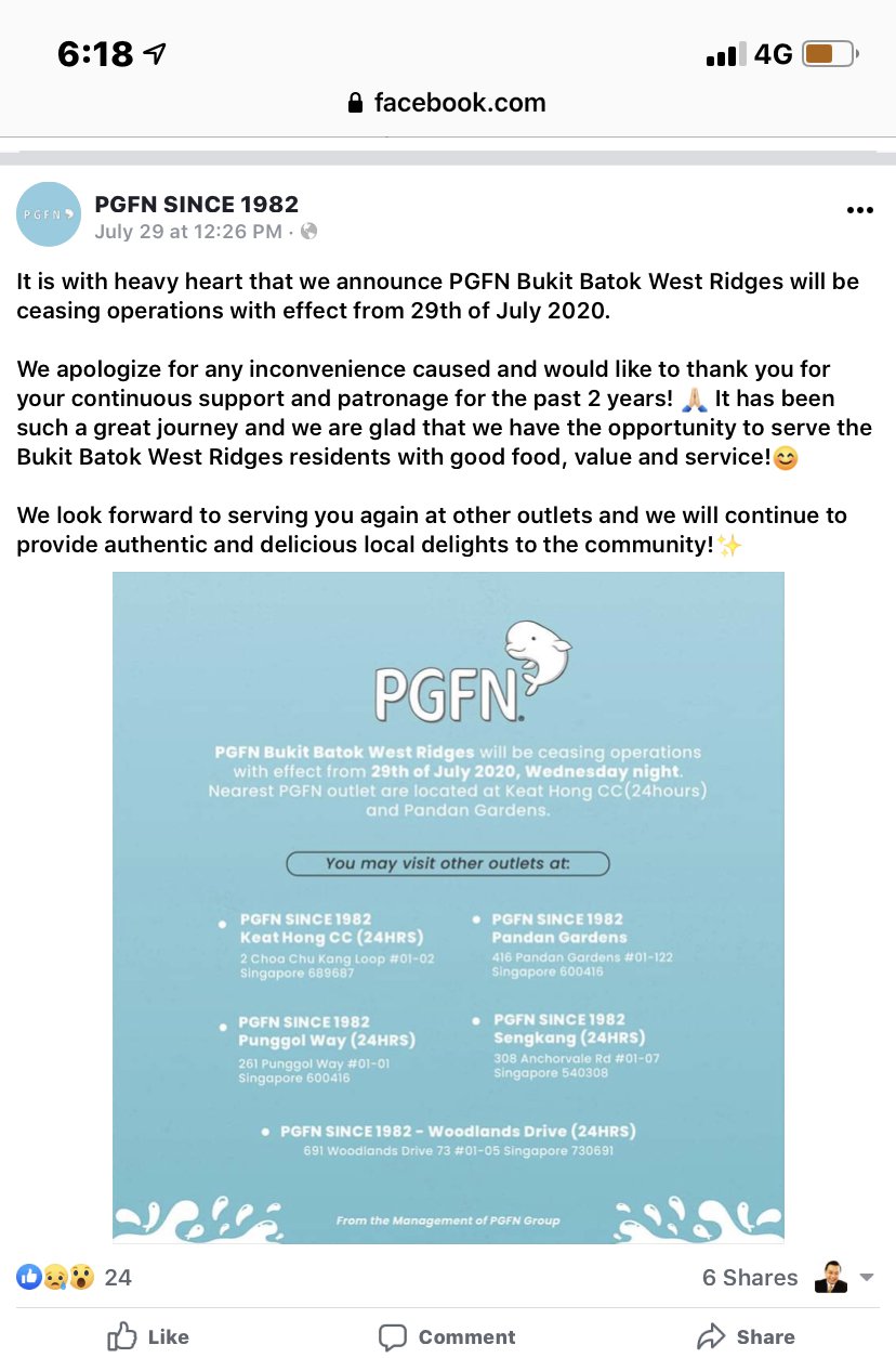 August 19, 20205 yr Author Staff On 1/17/2019 at 5:18 PM, Cecil Lee said: Pandan Gardens Fishball Noodles PGFN at Bukit Batok West Ridge. Small is $3.50/-. Their Mee Pok noodle is springy and generally their noodle is light even with so much chillies added. No overpowering taste or smell Nor salty. Quite comparable to Guan’s Mee Pok version. On 19.8.2020 This stall closed shop at West Ridge. Was curious so found this notice on their Facebook:-
