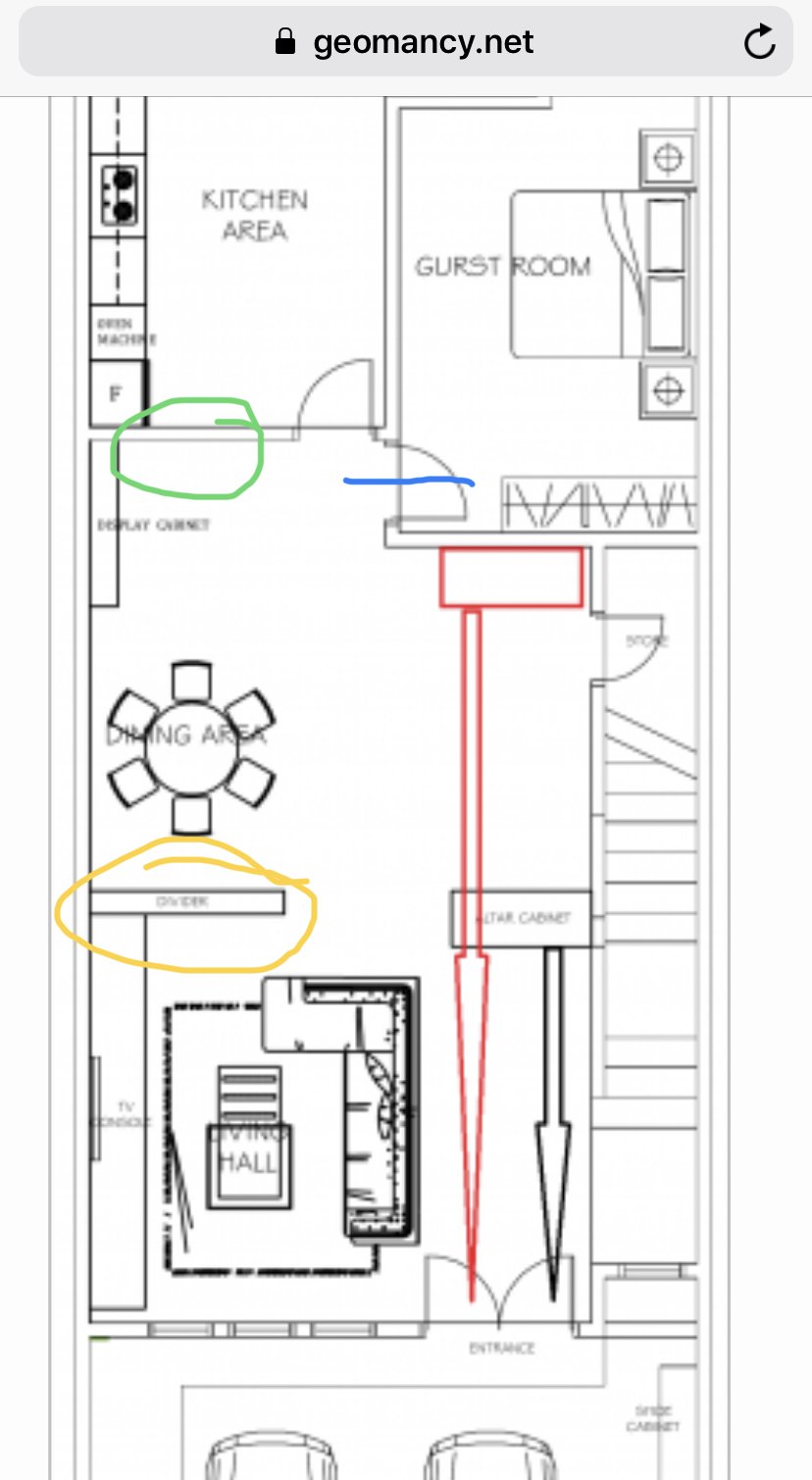 January 12, 20197 yr Staff No motivation if the partition highlighted in yellow is as shown with the altar level with it. Possible to be at green but under a few considerations: 1. Proper dimensions of the altar particularly the height is to be correct 2. No oven, stove or microwave sharing the same wall as the altar 3. Although the side of the altar faces the guest room is no issue (marked by a blue line); Nevertheless some conservative persons will say it is inauspicious for this. To shut up ? their mouth, possible to get an enclosed altar with a solid wooden side wall facing the bedroom wall...
