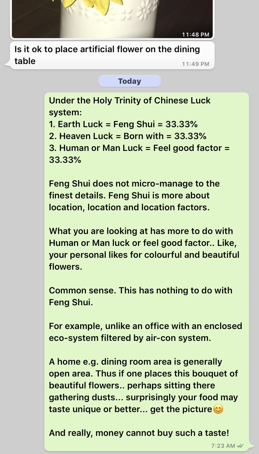 Posted January 15, 20196 yr Staff Is it ok to place artificial flower on the dining table? Under the Holy Trinity of Chinese Luck system: 1. Earth Luck = Feng Shui = 33.33% 2. Heaven Luck = Born with = 33.33% 3. Human or Man Luck = Feel good factor = 33.33% Feng Shui does not micro-manage to the finest details. Feng Shui is more about location, location and location factors. What you are looking at has more to do with Human or Man luck or feel good factor.. Like, your personal likes for colourful and beautiful flowers. Common sense. This has nothing to do with Feng Shui. For example, unlike an office with an enclosed eco-system filtered by air-con system. A home e.g. dining room area is generally open area. Thus if one places this bouquet of beautiful flowers.. perhaps sitting there gathering dusts... surprisingly your food may taste unique or better... get the picture? And really, money cannot buy such a taste!