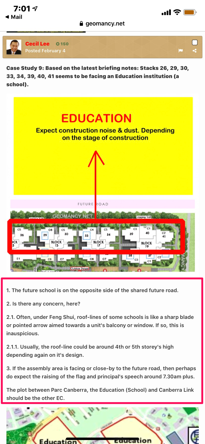 February 4, 20205 yr Author Staff Case Study 9: Based on the latest briefing notes: Stacks 26, 29, 30, 33, 34, 39, 40, 41 seems to be facing an Education institution (a school). 1. The future school is on the opposite side of the shared future road. 2. Is there any concern, here? 2.1. Often, under Feng Shui, roof-lines of some schools is like a sharp blade or pointed arrow aimed towards a unit's balcony or window. If so, this is inauspicious. 2.1.1. Usually, the roof-line could be around 4th or 5th storey's high depending again on it's design. 3. If the assembly area is facing or close-by to the future road, then perhaps do expect the raising of the flag and principal's speech around 7.30am plus. The plot between Parc Canberra, the Education (School) and Canberra Link should be the other EC.