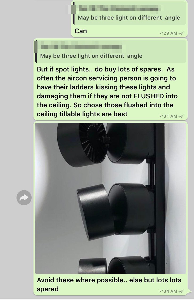 Posted July 5, 20196 yr Staff Q: And on top how many light can we put ? Just one or can hv many light to shine on painting and right corner Reply: But if spot lights.. do buy lots of spares. As often the aircon servicing person is going to have their ladders kissing these lights and damaging them if they are not FLUSHED into the ceiling. So chose those flushed into the ceiling tillable lights are best.
