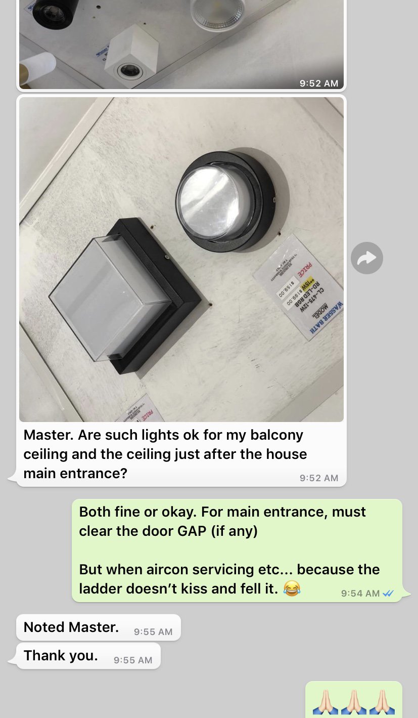 July 31, 20196 yr Author Staff Master. Are such lights ok for my balcony ceiling and the ceiling just after the house main entrance? Both fine or okay. For main entrance, must clear the door GAP (if any) But when aircon servicing etc... because the ladder doesn’t kiss and fell it. ?