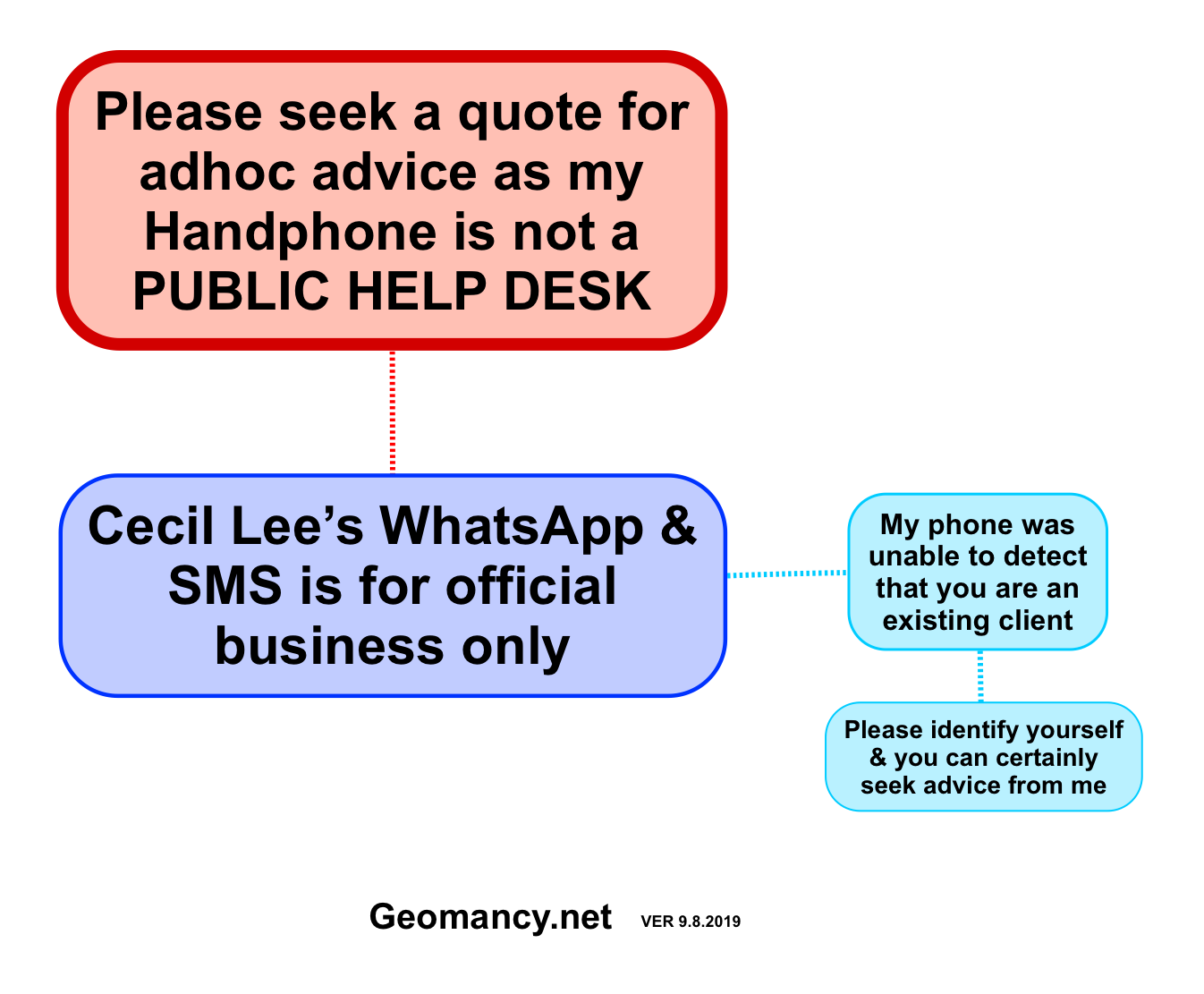 Posted August 15, 20196 yr Staff Cecil Lee’s WhatsApp & SMS is for official business only My phone was unable to detect that you are an existing client Please identify yourself & you can certainly seek advice from me Please seek a quote for adhoc advice as my Handphone is not a PUBLIC HELP DESK Geomancy.net VER 9.8.2019