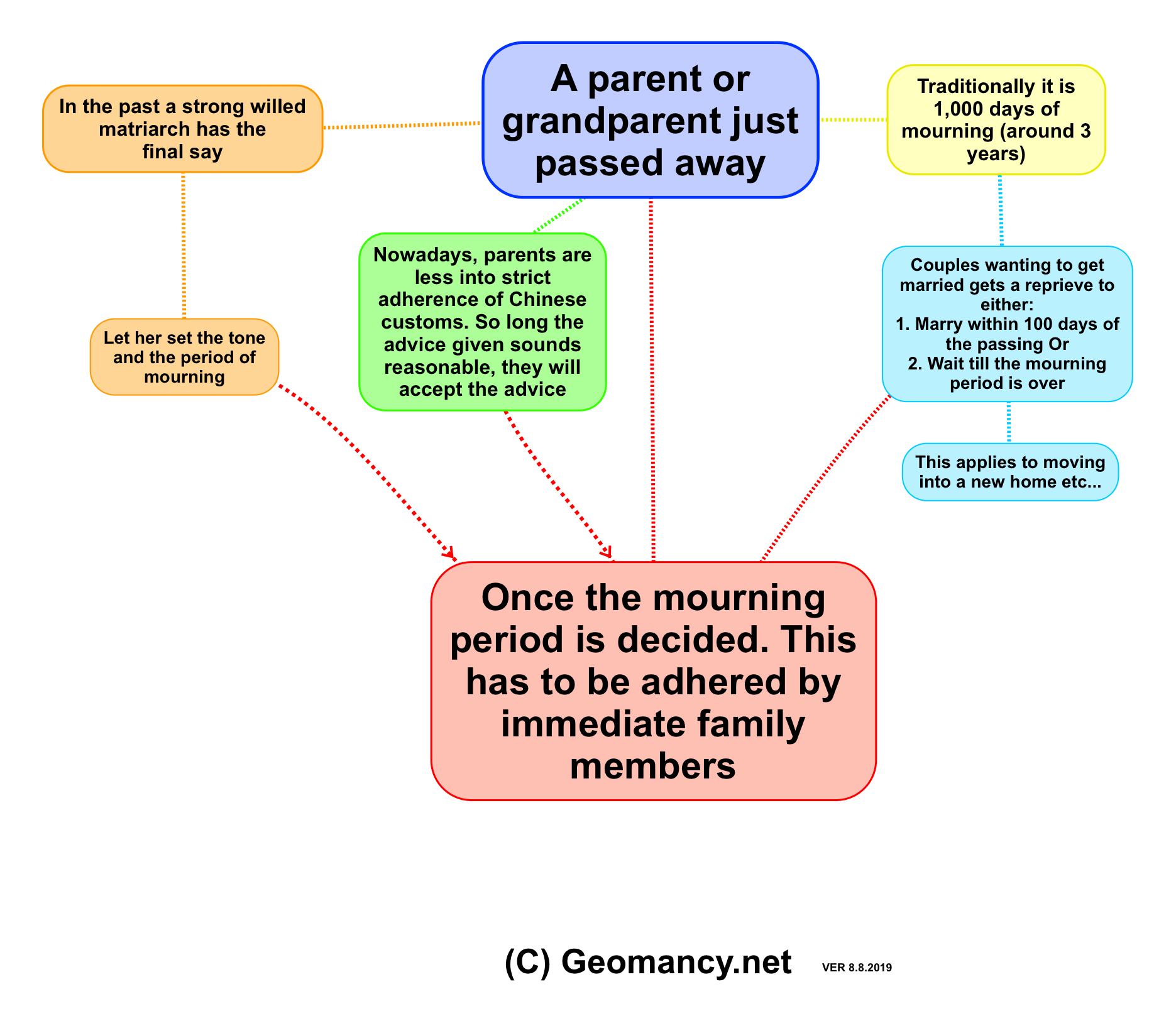 August 15, 20196 yr Author Staff A parent or grandparent just passed away In the past a strong willed matriarch has the final say Let her set the tone and the period of mourning Nowadays, parents are less into strict adherence of Chinese customs. So long the advice given sounds reasonable, they will accept the advice Traditionally it is 1,000 days of mourning (around 3 years) Couples wanting to get married gets a reprieve to either: 1. Marry within 100 days of the passing Or 2. Wait till the mourning period is over This applies to moving into a new home etc... Once the mourning period is decided. This has to be adhered by immediate family members (C) Geomancy.net VER 8.8.2019