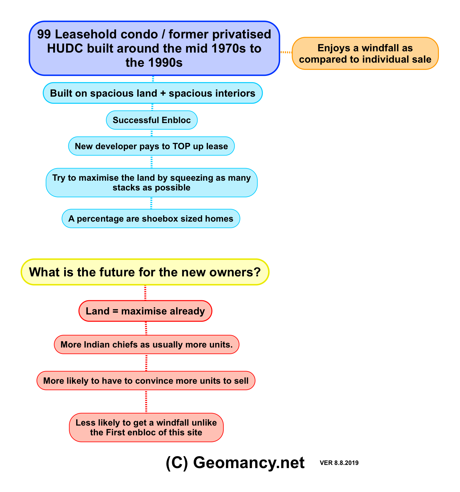 August 15, 20196 yr Author Staff (C) Geomancy.net 99 Leasehold condo / former privatised HUDC built around the mid 1970s to the 1990s Built on spacious land + spacious interiors Successful Enbloc New developer pays to TOP up lease Try to maximise the land by squeezing as many stacks as possible A percentage are shoebox sized homes Enjoys a windfall as compared to individual sale What is the future for the new owners? Land = maximise already More Indian chiefs as usually more units. More likely to have to convince more units to sell Less likely to get a windfall unlike the First enbloc of this site VER 8.8.2019