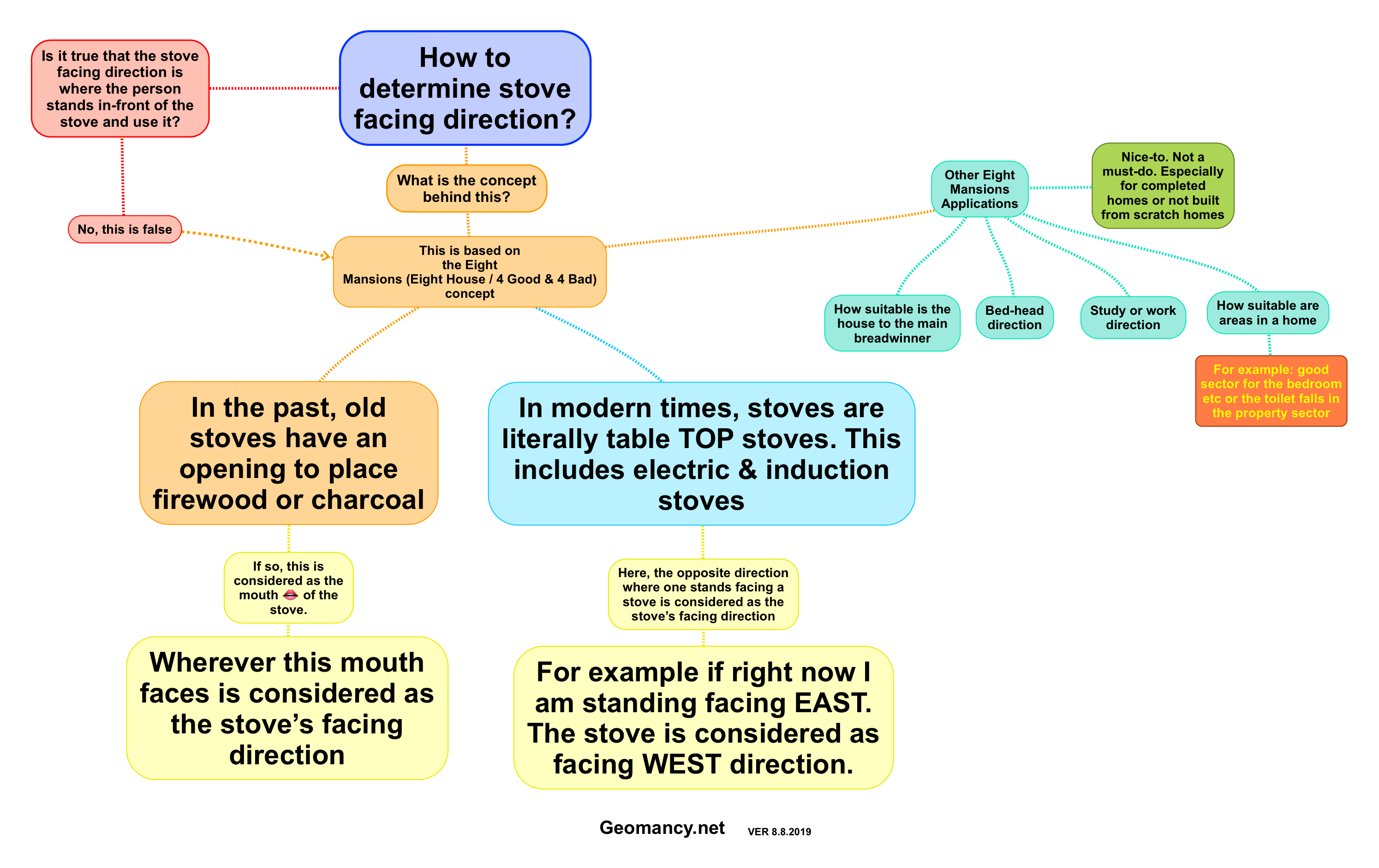August 15, 20196 yr Author Staff How to determine stove facing direction? Is it true that the stove facing direction is where the person stands in-front of the stove and use it? No, this is false What is the concept behind this? This is based on the Eight Mansions (Eight House / 4 Good & 4 Bad) concept In the past, old stoves have an opening to place firewood or charcoal If so, this is considered as the mouth ? of the stove. Wherever this mouth faces is considered as the stove’s facing direction In modern times, stoves are literally table TOP stoves. This includes electric & induction stoves Here, the opposite direction where one stands facing a stove is considered as the stove’s facing direction For example if right now I am standing facing EAST. The stove is considered as facing WEST direction. Other Eight Mansions Applications Bed-head direction Nice-to. Not a must-do. Especially for completed homes or not built from scratch homes Study or work direction How suitable is the house to the main breadwinner How suitable are areas in a home For example: good sector for the bedroom etc or the toilet falls in the property sector Geomancy.net VER 8.8.2019