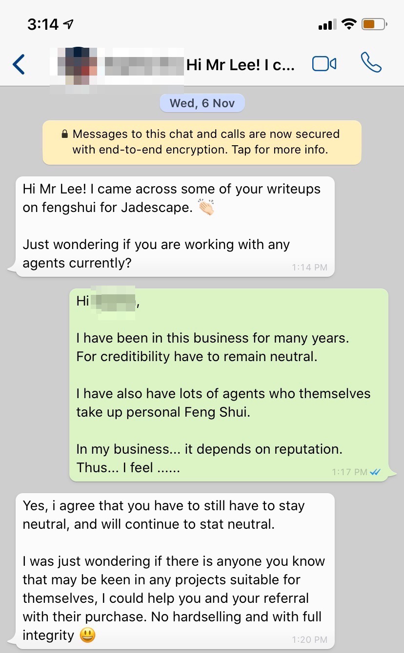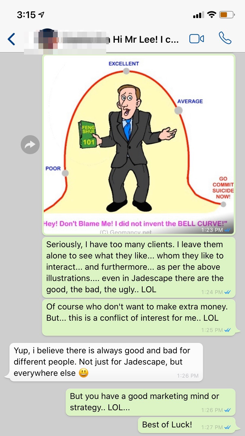 Posted November 13, 20196 yr Staff Hi Mr Lee! I came across some of your writeups on fengshui for Jadescape. ?? Just wondering if you are working with any agents currently? Hi xxxx, I have been in this business for many years. For creditibility have to remain neutral. I have also have lots of agents who themselves take up personal Feng Shui. In my business... it depends on reputation. Thus... I feel ...... Seriously, I have too many clients. I leave them alone to see what they like... whom they like to interact... and furthermore... as per the above illustrations.... even in Jadescape there are the good, the bad, the ugly.. LOL Of course who don't want to make extra money. But... this is a conflict of interest for me.. LOL