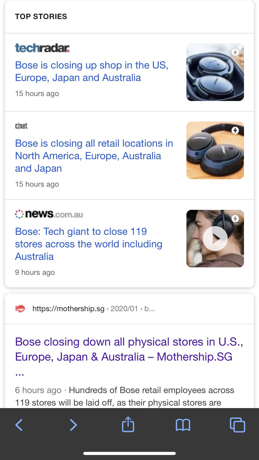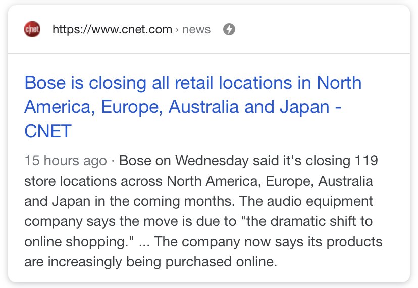 Posted January 16, 20206 yr Staff 15 hours ago · Bose on Wednesday said it's closing 119 store locations across North America, Europe, Australia and Japan in the coming months. The audio equipment company says the move is due to "the dramatic shift to online shopping." ... The company now says its products are increasingly being purchased online. Source and credit as shown on the various images:-