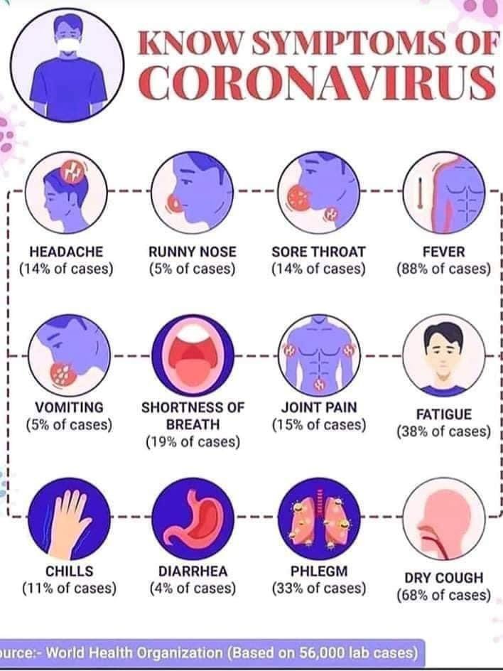 March 27, 20205 yr Author Staff In a glance:- HOW TO KNOW IF YOU HAVE A COVID-19 VIRUS These are the symptoms: Source: Ministry of Health, Singapore Day 1-3 1. Common Cold 2. Itchy throat 3. No fever, no fatigue & good eating & drinking seems normal. Day 4 1. Painful throat, more itchy/scratchy. The body is weak, & seems intoxicated 2. Hoarseness (husky voice) 3. 36.5° body temperature 4. Start to decrease appetite include not wanting to eat & drink water 5. Mild head pain/headache 6. Mild diarrhea Day 5 1. Inflammation of the throat (You might see white dots or patches in the back of your throat-might be red & swollen). Hoarseness until you lose your voice. 2. 36.5°-36.7° body temperature 3. The body is weak (body malaise) and joint pain(the pain is like rheumatism or gout) Day 6 1. 37° body temperature (fever) 2. A dry cough (coughing without phlegm) 3. Painful throat while eating, worsens when you swallow & when you talk 4. Body malaise, nausea or recurrent vomiting 5. Mild breathing problems/shortness of breath 6. Hand & finger pains 7. Vomiting (throwing up) and diarrhea (watery bowel movements) Day 7 1. High fever from 37.4°-37.8° 2. Persistent cough with phlegm 3. Headache/head pain along with diarrhea 4. Persistent diarrhea 5. Persistent vomiting Day 8 1. Fever 38° above 2. Breathing problems/Shortness of breath 3. Persistent cough 4. Headache, more joint pain, that passes in the lower back like pain in the buttocks (lumbar strain) Day 9 1. No relief at all 2. Fever is getting high temperature 3. Persistent cough with phlegm 4. Worsening shortness of breath If you feel all these, please go to the nearest Hospital's Emergency Room for a free testing kit and medication. There is no need to be afraid of having checked on what is being felt to avoid the loss of life for no reason. Thanks a lot! This should be something everyone should be aware of.