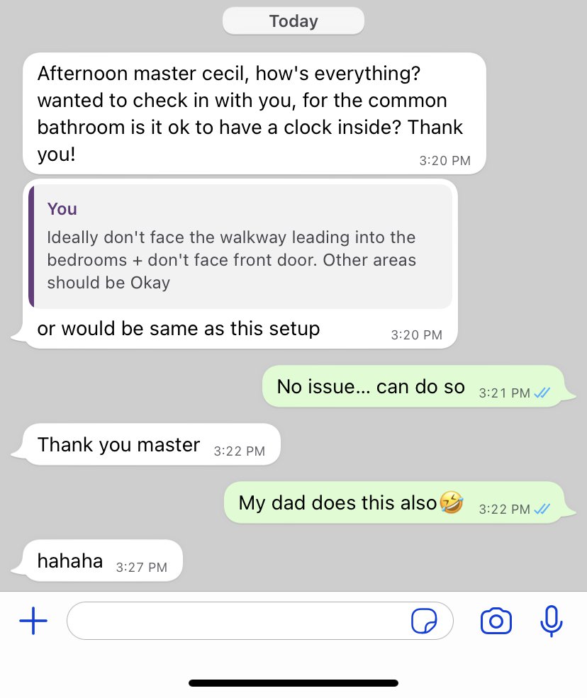 December 20, 20214 yr Staff Afternoon master cecil, how's everything? wanted to check in with you, for the common bathroom is it ok to have a clock inside? Thank you! No issue… can do so My dad does this also