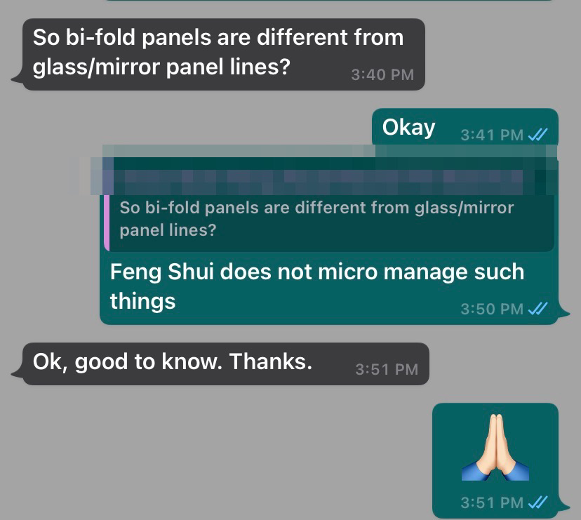 June 7, 20214 yr Author Staff So bi-fold panels are different from glass/mirror panel lines? Reply: Feng Shui does not micro manage such things. (Unless it is based on symbolism eg. Of two pieces of mirror “splitting” the dining table into half )