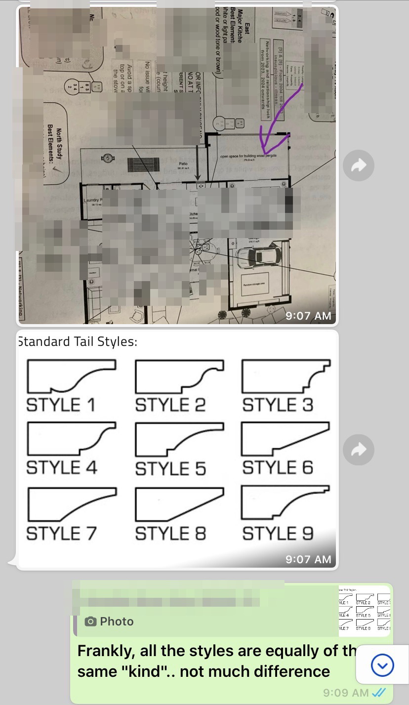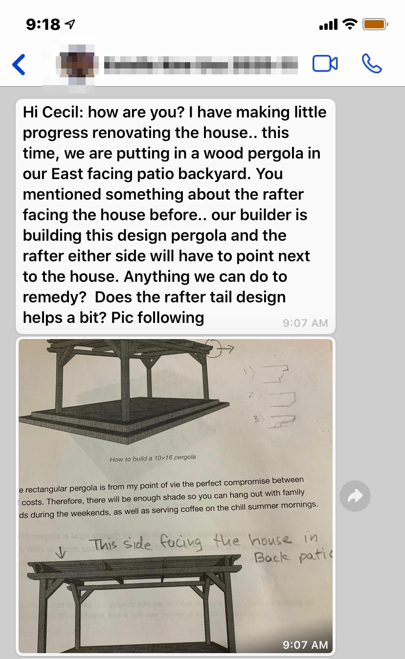 Posted July 22, 20205 yr Staff Hi Cecil: how are you? I have making little progress renovating the house.. this time, we are putting in a wood pergola in our East facing patio backyard. You mentioned something about the rafter facing the house before.. our builder is building this design pergola and the rafter either side will have to point next to the house. Anything we can do to remedy? Does the rafter tail design helps a bit? Pic following