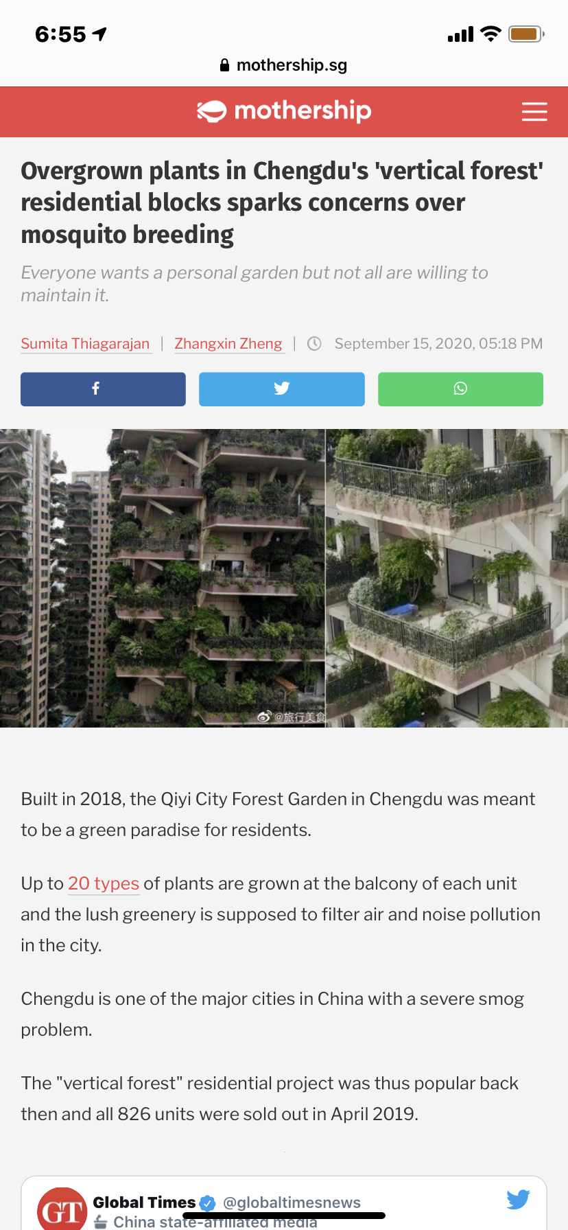 Posted September 15, 20205 yr Staff Source & Credit: Mothership.sg September 15, 2020 Overgrown plants in Chengdu's 'vertical forest' residential blocks sparks concerns over mosquito breeding