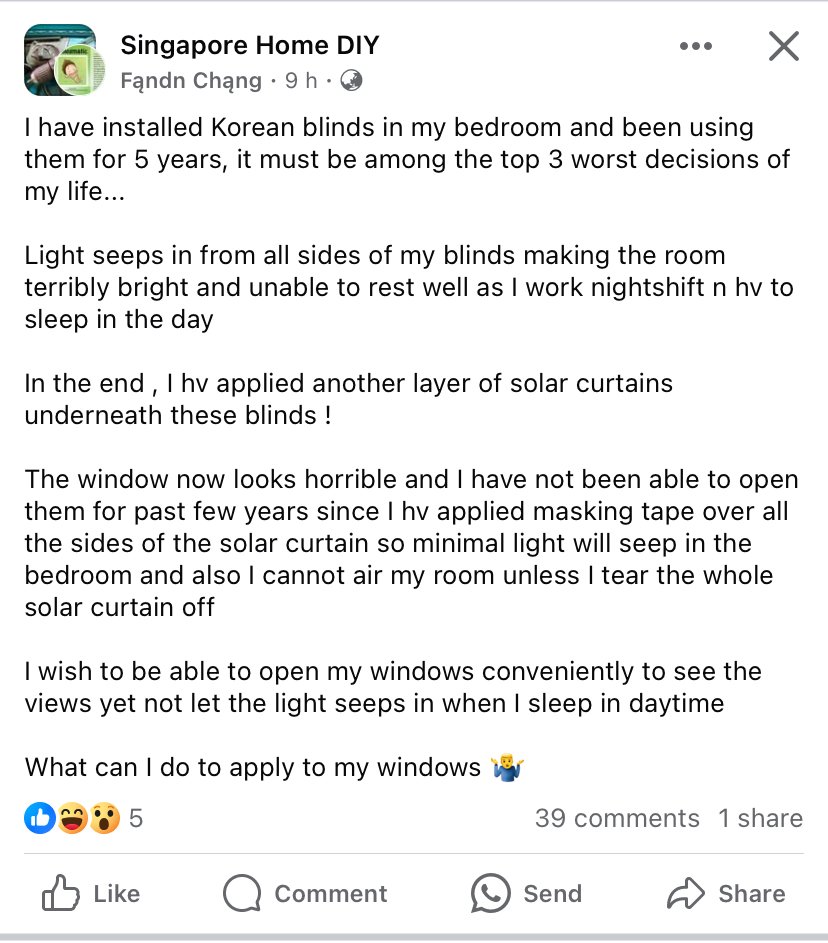 May 9, 20241 yr Author Staff Source & Credit: I have installed Korean blinds in my bedroom and been using them for 5 years, it must be among the top 3 worst decisions of my life... Light seeps in from all sides of my blinds making the room terribly bright and unable to rest well as I work nightshift n hv to sleep in the day In the end , I hv applied another layer of solar curtains underneath these blinds ! The window now looks horrible and I have not been able to open them for past few years since I hv applied masking tape over all the sides of the solar curtain so minimal light will seep in the bedroom and also I cannot air my room unless I tear the whole solar curtain off I wish to be able to open my windows conveniently to see the views yet not let the light seeps in when I sleep in daytime What can I do to apply to my windows 🤷♂️