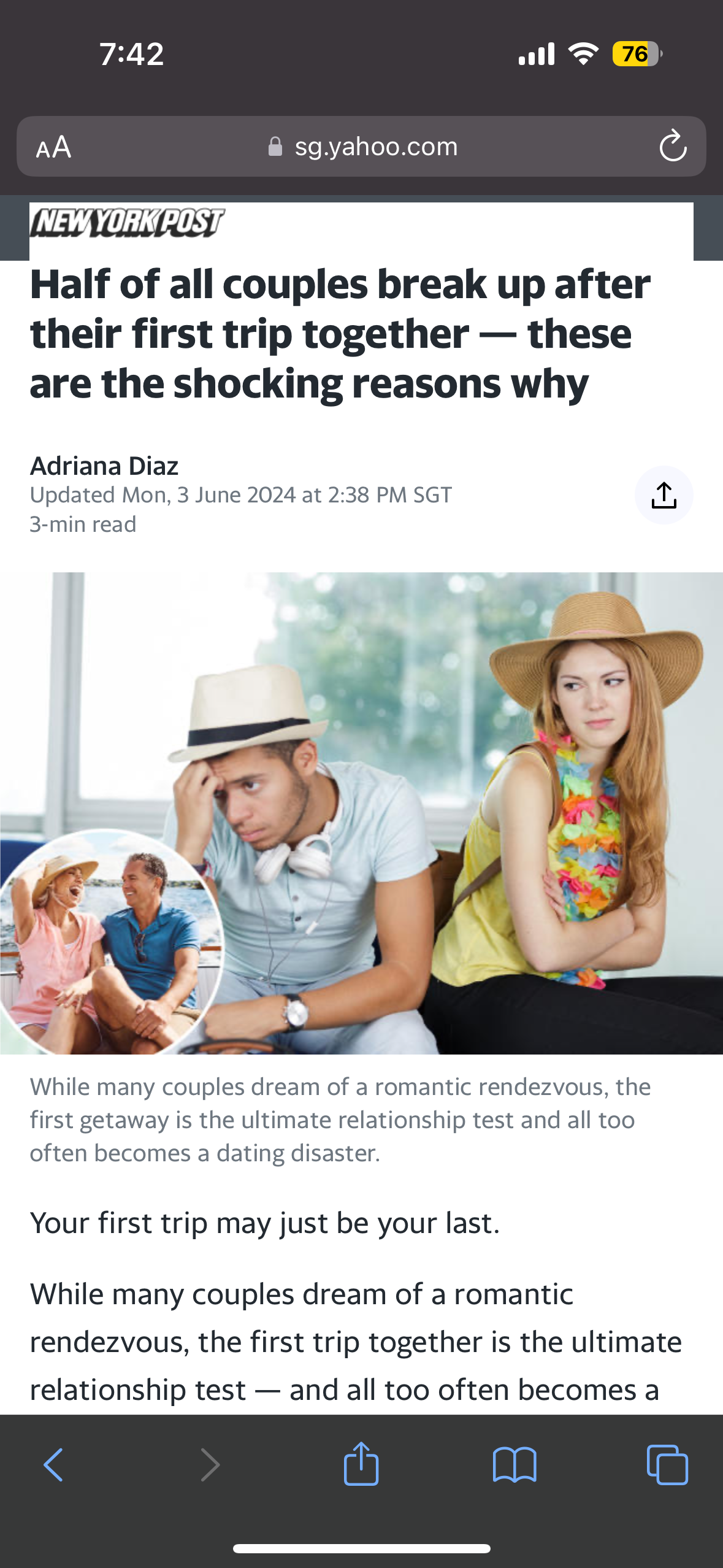 June 4, 20241 yr Author Staff Possible way to getting a divorce? Go for a first trip together… Source & Credit: