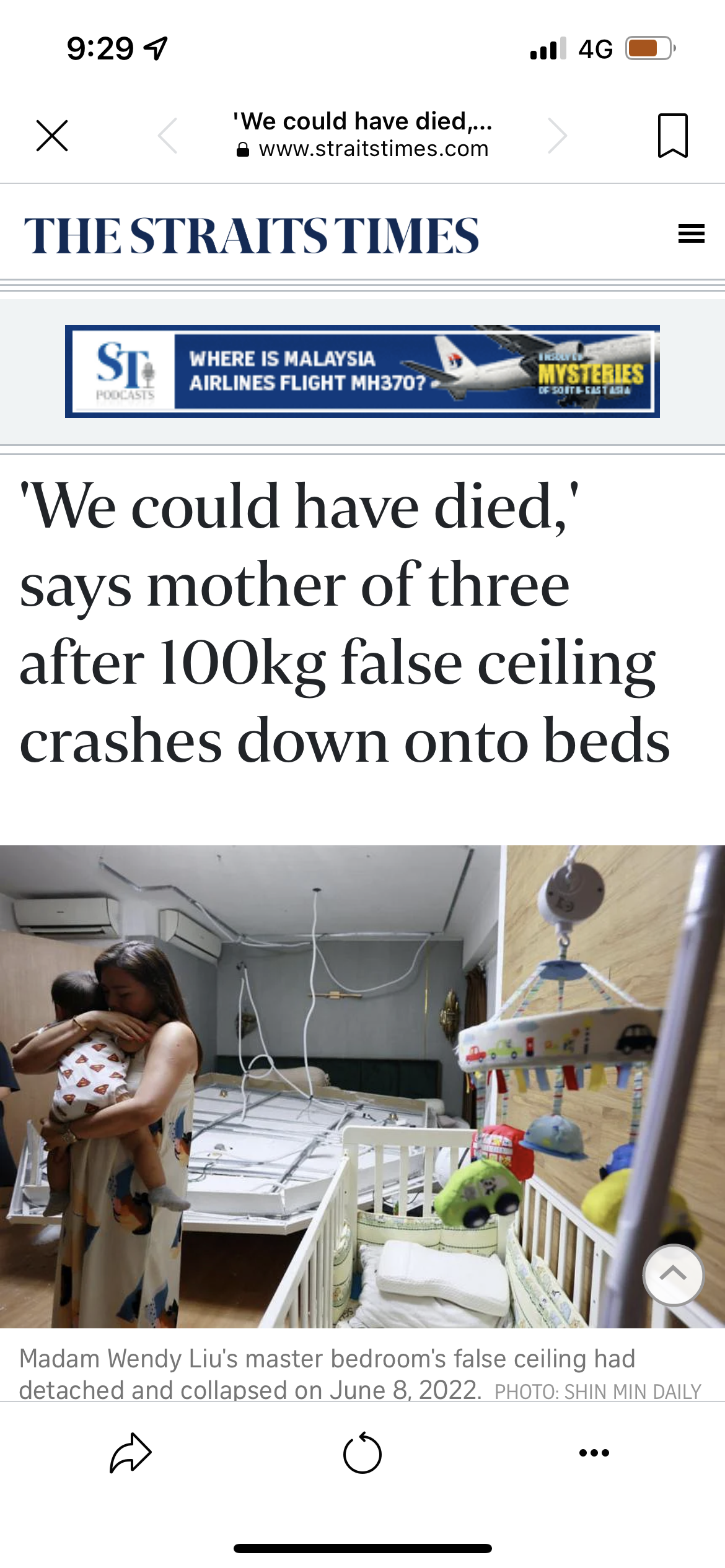 Posted June 10, 20223 yr Staff Credit: The Straits Times, 2 June 2022 'We could have died,' says mother of three after 100kg false ceiling crashes down onto beds