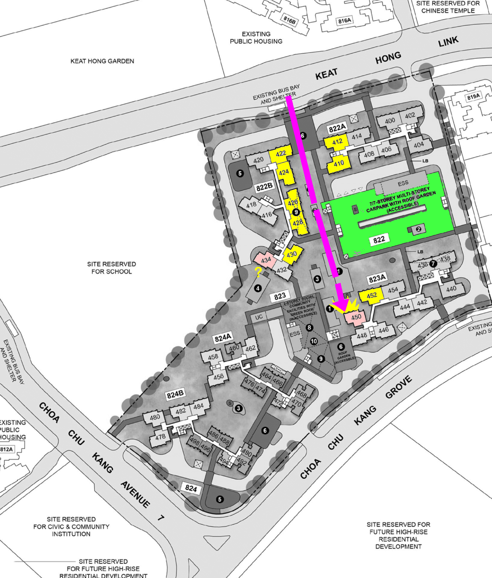 August 31, 20223 yr Author Staff Case Study 3A: HENG AH! Very Lucky right? HDB Keat Hong Grange does not have a temple that directly faces it's plot of land! 1. Every temple has a a burning offering mount or chimney. Some nicely decorated as a Pagoda. 2. For the future temple, there is a possibility that such an offering mount could be located at either X or Y:- 3. Here, even, if the temple is no threat to the occupants to a unit, the frequent burning of incense and the smell may permeate towards one's dwelling. 3.1. For example, last year I paid a visit to a client staying around the 6th storey of Block 923 Jurong West St 92, I could still smell incense smoke coming from the Jin Fu Gong Temple. Most likely the wind brought the smoke/smell towards the vicinity of the block:- Related: "No Joke! Large incense burning cauldron. How many did you see?" “Bad news for homes - new HDB BTO Nanyang Emerald! These incense cauldrons are currently located around the red ring area: Case Study 3B: Have an altar in you new home? Of Devil's Gate at NE and SW 4. These stacks highlighted in yellow e.g. 400, 412, 414, 415, 416, 418, 420, 422 and 424 falls within the NE to SW path of the future Chinese temple. 5. Take extra care in the placement of an altar or Hindu pooja (also altar) to avoid it becoming a portal as a devil's gate: front door or back door. Related: Case Study 3C: Any concern as we have an indirect view of the temple? To future proof one's investment, it is still preferred to TRY and avoid especially Stack 400 and 402. Frankly, Stacks 412 and 414 are acceptable. (Other than the number 414 as mentioned under Case Study 1.