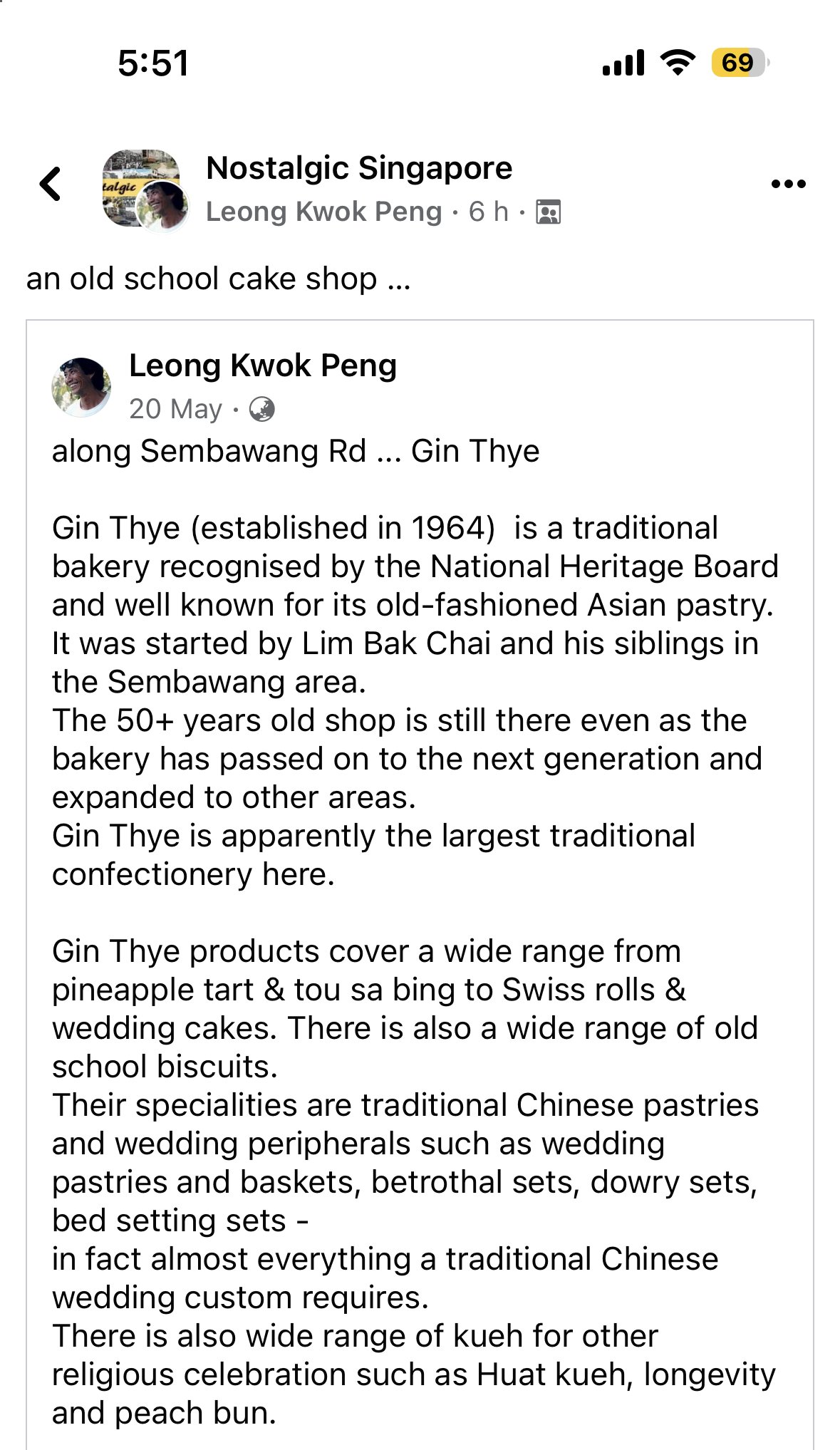 Posted May 30, 20232 yr Staff Please note that I am in no way associated with this store. ++++++++++++++++++++ Simply find it interesting to be highlighted under our Current Affairs and Lifestyle Thread. Noteworthy that I am slightly older than the store. LOL ++++++++++++++++++ +++++++++++++ ++++++ Gin Thye Traditional Bakery 427 Sembawang Road, Singapore 758394 https://ginthye.com/ Source and Credit: along Sembawang Rd ... Gin Thye Gin Thye (established in 1964) is a traditional bakery recognised by the National Heritage Board and well known for its old-fashioned Asian pastry. It was started by Lim Bak Chai and his siblings in the Sembawang area. The 50+ years old shop is still there even as the bakery has passed on to the next generation and expanded to other areas. Gin Thye is apparently the largest traditional confectionery here. Gin Thye products cover a wide range from pineapple tart & tou sa bing to Swiss rolls & wedding cakes. There is also a wide range of old school biscuits. Their specialities are traditional Chinese pastries and wedding peripherals such as wedding pastries and baskets, betrothal sets, dowry sets, bed setting sets - in fact almost everything a traditional Chinese wedding custom requires. There is also wide range of kueh for other religious celebration such as Huat kueh, longevity and peach bun. Source & Credit: