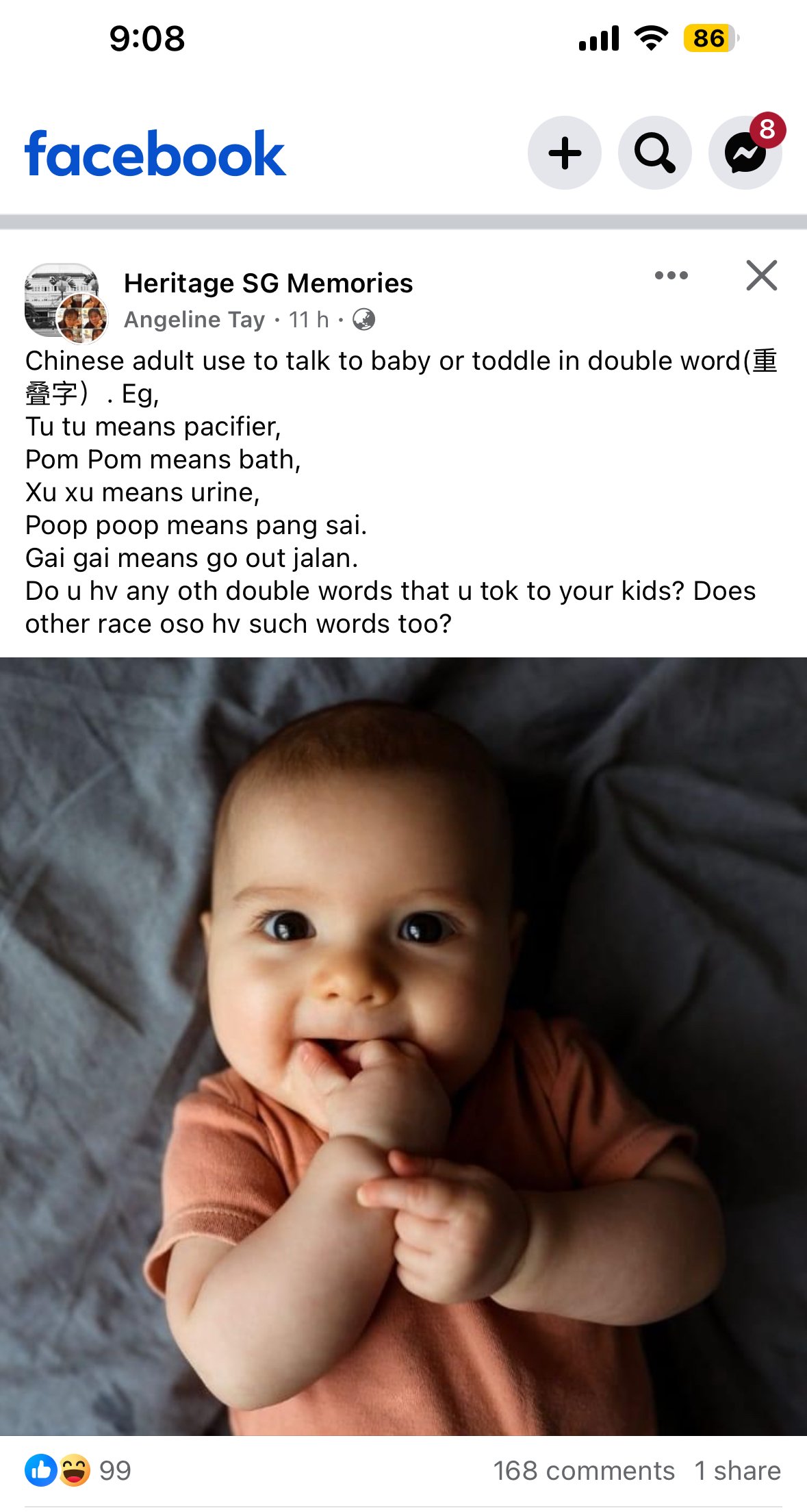 Posted January 21, 20241 yr Staff How true… Source & Credit: Chinese adult use to talk to baby or toddle in double word(重叠字). Eg, Tu tu means pacifier, Pom Pom means bath, Xu xu means urine, Poop poop means pang sai. Gai gai means go out jalan. Do u hv any oth double words that u tok to your kids? Does other race oso hv such words too? Source & Credit:And