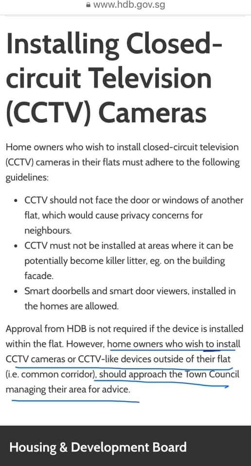 Posted February 17, 20241 yr Staff Installing CCTV cameras along the common corridor? Can? Housing & Development Board's Guidelines: http://www.hdb.gov.sg Home owners who wish to install closed-circuit television (CCTV) cameras in their flats must adhere to the following guidelines: • CCTV should not face the door or windows of another flat, which would cause privacy concerns for neighbours. • CCTV must not be installed at areas where it can be potentially become killer litter, eg. on the building facade. • Smart doorbells and smart door viewers, installed in the homes are allowed. Approval from HDB is not required if the device is installed within the flat. However. home owners who wish to install CCTV cameras or CCTV-like devices outside of their flat (i.e. common corridor), should approach the Town Council managing their area for advice. Source & Credit: