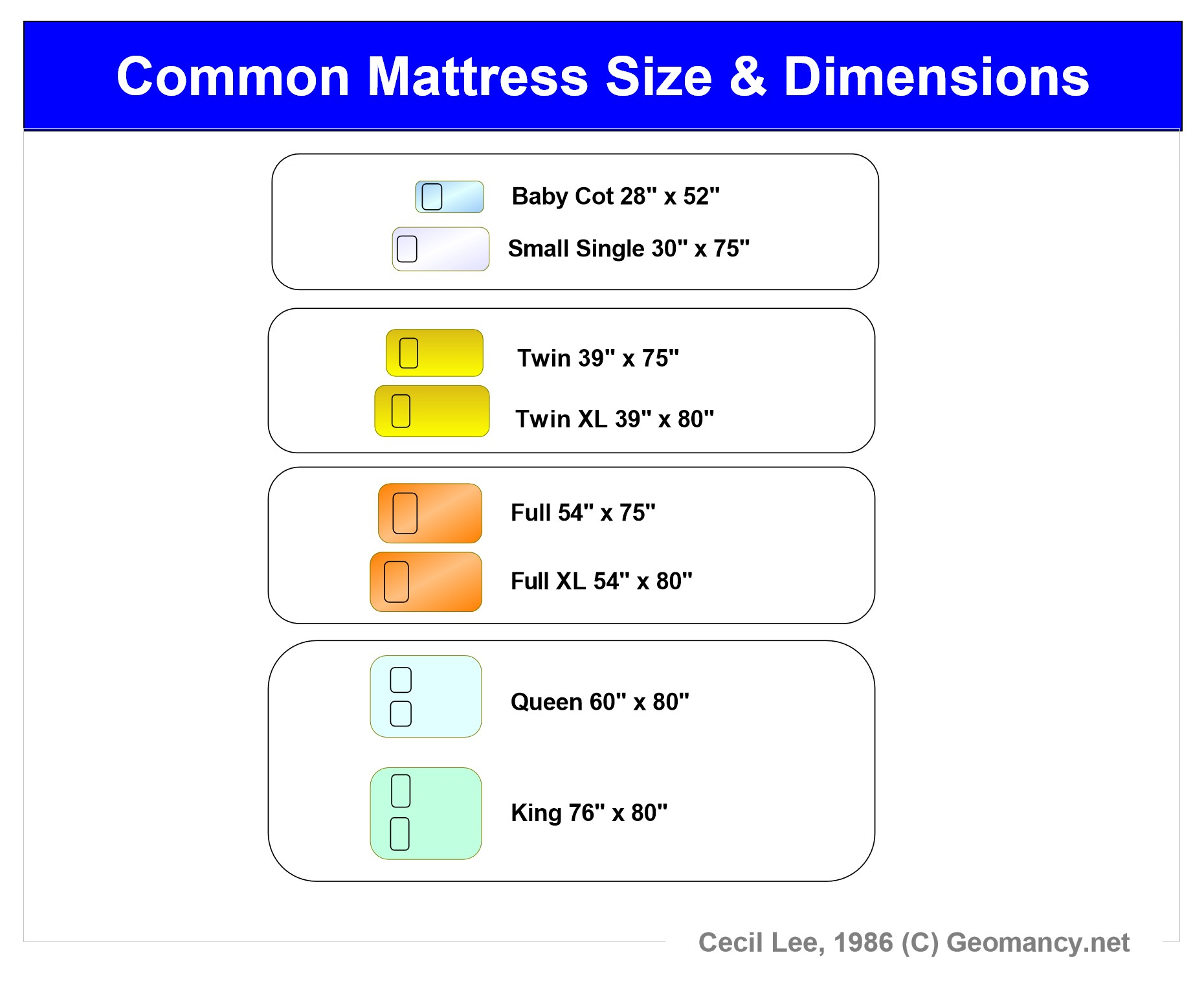 Posted January 28, 20251 yr Staff Common Mattress Size and Dimensions in Singapore Baby Cot 28" by 52" Small Single 30" x 75" +++ Twin 39" x 75" Twin XL 39" x 80" +++ Full 54" x 75" Full XL 54" x 80" +++ Queen 60" x 80" King 76" x 80"