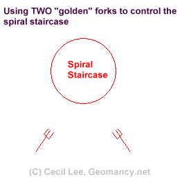 Posted January 11, 200223 yr Staff Dear Anil,1. For the sector, if it is out of balance, then #5 and #2 should be cured. Before this, it is looking at the three Mountain #, Water # and Base # together.2. Applying the concept of " If one cannot see it; it no longer becomes a threat ".In such a situation, you may want to use e.g. day curtain to solve the problem. But if you prefer to open the curtain; one good remedy is the use of Two forks:Please see the attached illustration below. (Note: for those who participate thru this forum using mailing list, you may have to log in to the forum to view this graphic as all attachments are not sent thru the mailing list option.)On your window sill, you can place two forks aimed at your neighbour's `offending' spiral staircase to control it.In the illustration, it is called `Golden fork' but if you cannot find a gold or brass or nickel plated fork (ordinary desert fork) then use a stainless steel one. (Do not use any `cheap' plastic disposable fork.Note: the fork (metal) is used to control the spiral staircase and not to `destroy' it i.e. for those who look at the Destructive Cycle (ref: http://www.geomancy.net/resources/theories/fs-5element.htm ) Fire is the element that destroys metal. But, do not paint the spoon red in this case.The pointed edge of the two forks (will help) to stabalise the circular staircase.Warmest Regards,Cecil Quote On 1/11/2002 4:45:00 AM, Anonymous wrote:Hello Cecil,There is a building very closeto the South which has a metalspiral stairoverlooking our dining roomwindow.Is this inauspicious. Howeverone must factorise that the MSis 5 and TS 2in this sector of the houseand the metal of the stairstho outside mayweaken these unfavourablestars.. If the spiralstaircase is inauspiciousthen what is the remedy.thanksAnil