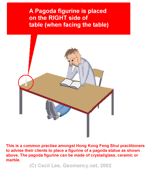 Posted June 17, 200223 yr Staff Dear All,1. This concept is not a modern invention.2. In the past, I had written in this forum about this concept.3. The concept: If one look out of a child's bedroom and a distance away, on the right side; if there is a structure i.e. looks like a profile of e.g. a pagoda or high tension wire (note that this is a distance away); this is considered auspicious. Here, it implies that there will be `scholars' or children will do exceptionally well in their studies.4. In Hong Kong, many Feng Shui practitioners have advised their clients to place a pagoda figurine on their children's study table. Please refer to attached illustration.5. Here, the pagoda figurine can be e.g. clear glass, crystal; ceramic (like those found in fish tanks); or even marble or metallic.Warmest Regards,Cecil