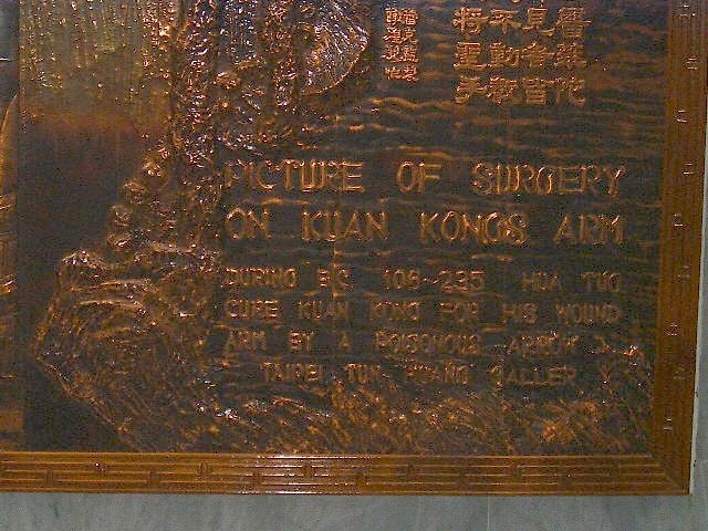 Posted June 18, 200223 yr Staff This artwork can be found at the reception lobby at the Mount Elizabeth Hospital, Singapore.It shows the ancient Chinese Physician: Hua Tuo cure Kuan Kong for his wound on his arm by a poison arrow. (During around BC 106-225).