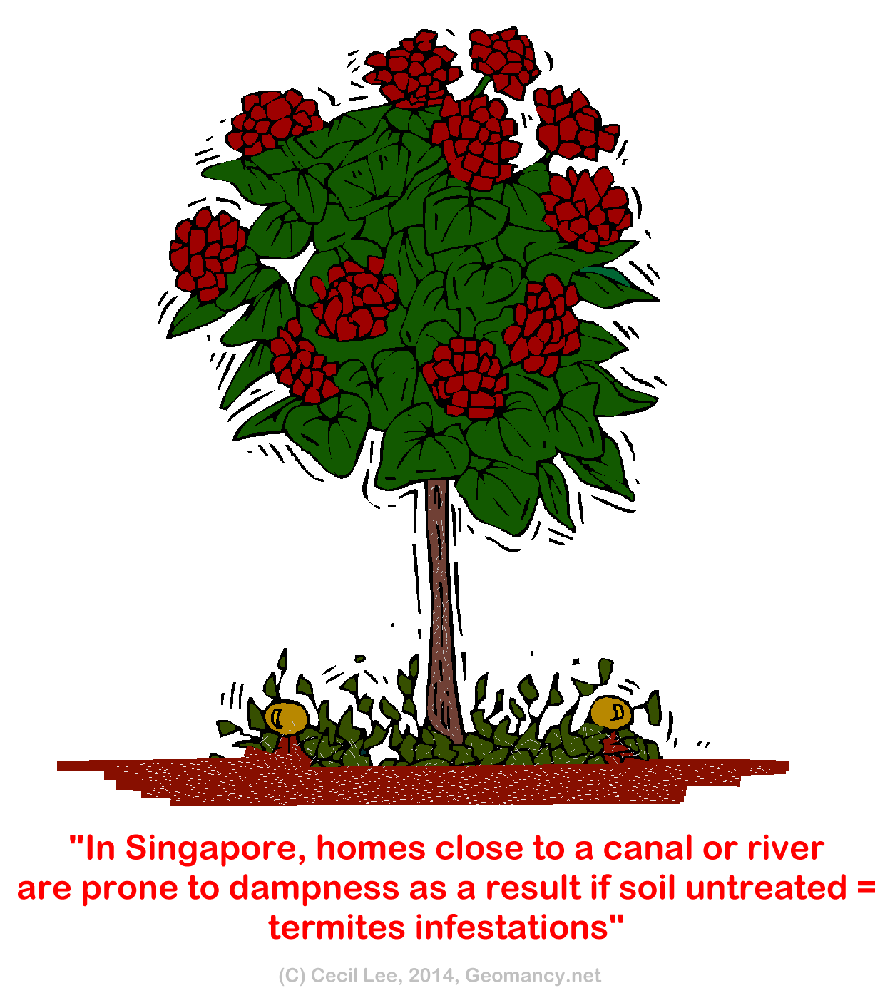 Posted January 10, 200323 yr Staff 1. This is more of a commonsense. But, it does invariably affect both your Man (person) and Earth (Feng Shui).2. In Singapore, if you are ever considering buying a second-hand landed property be it a terrace, semi-detached or a bungalow (a house on it's own), please take heed of the following story:-3. Do take note if you stay at St Michael's Road/Towner Road, Pasir Ris and many areas that are close to canals or damp locations:"There was once (6 years ago), I went to a bungalow at St Michael's Road in Singapore to do a Feng Shui audit.""As part of the audit, I checked the flooring and found some very strange cracks on the floor".4. This is an important consideration, as the foundation is important for a FS accessment."I peered down into a crack, and low and behold, I saw the face of a termite smiling at me thru the crack. The termite, "greeted" me with surprise!"5. The owner immediately called the pest control people to exterminate these white ants (termites).6. Do excercise care, when you next look at a second-hand terrace or any landed property especially with locations that have dampness such as a canal even as far as 1 km away.7. This is because, when the property was new, most probably, the site which the building is, has been treated with slow release chemicals that keep termites away. But, if there was regular pest control check done annually, then, your entire investment can literally be `eaten' away right under your very nose.The morale of the story " Prevention is better than cure! "Warmest Regards,Cecil