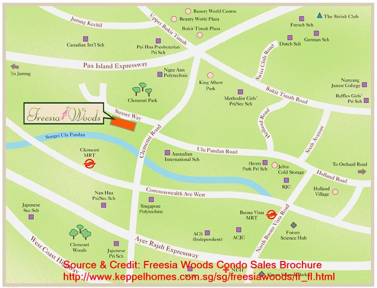 Posted July 12, 200322 yr Staff Freesia Woods CondominiumLocation: Sunset WayDeveloper: Keppel Homes, Keppel LandWebsite: http://www.keppelhomes.com.sg/Specific website for Freesia Woods Condominium:http://www.freesiawoods.com.sg/Tenure: Statutory Land GrantTOP: Immediately availableThis development comprises of 1 room, 2, 3 and 4 bedroom apartments.What I like about this development is that this condo is a low rise development where the maximium height is 5 storey high.Please see attachment file. If one notice carefully, What is not favourable is that Sungei Ulu Pandan river seems to be slicing into this site.As such, in my opinion, the overall site is not as auspicious. Especially for Block 63 units #07 to #12.Again, many Singaporeans are very discerning and often rush into true bargains. For this site, one still finds that many units are still for sale - in a relatively `choice' site.Warmest Regards,Cecil
