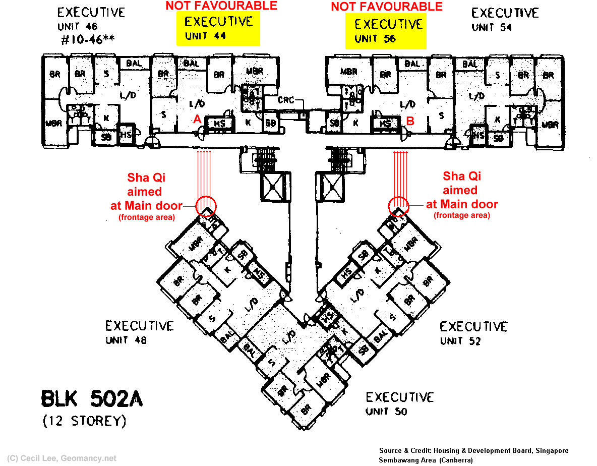 Posted November 3, 200322 yr Staff Dear All,In my opinion, Housing Development Board (HDB) Executive Apartments similar to Executive Units 44 and Unit 56 is "inauspicious".If one looks carefully in the illustration, the edge of the master bedroom toilet (external wall) of Executive Unit 48 is aimed at the frontage area of Unit 44. While Executive unit 52's external wall is aimed at the frontage of Unit 56.Warmest Regards,CecilAlthough it is not directly aimed at the main door, it the bulk of the flow is concentrated within the main door area. It will affect the main door since the `cutting' sha qi is wide and "penetrating". Erh.. good luck to those staying at Unit 44 or Unit 56 of Block 502A (12 storeys).A neighbouring Block 503A (13 storeys) also has exactly this configuration. For 503A Executive unit 01 and 13 also face this "situation".