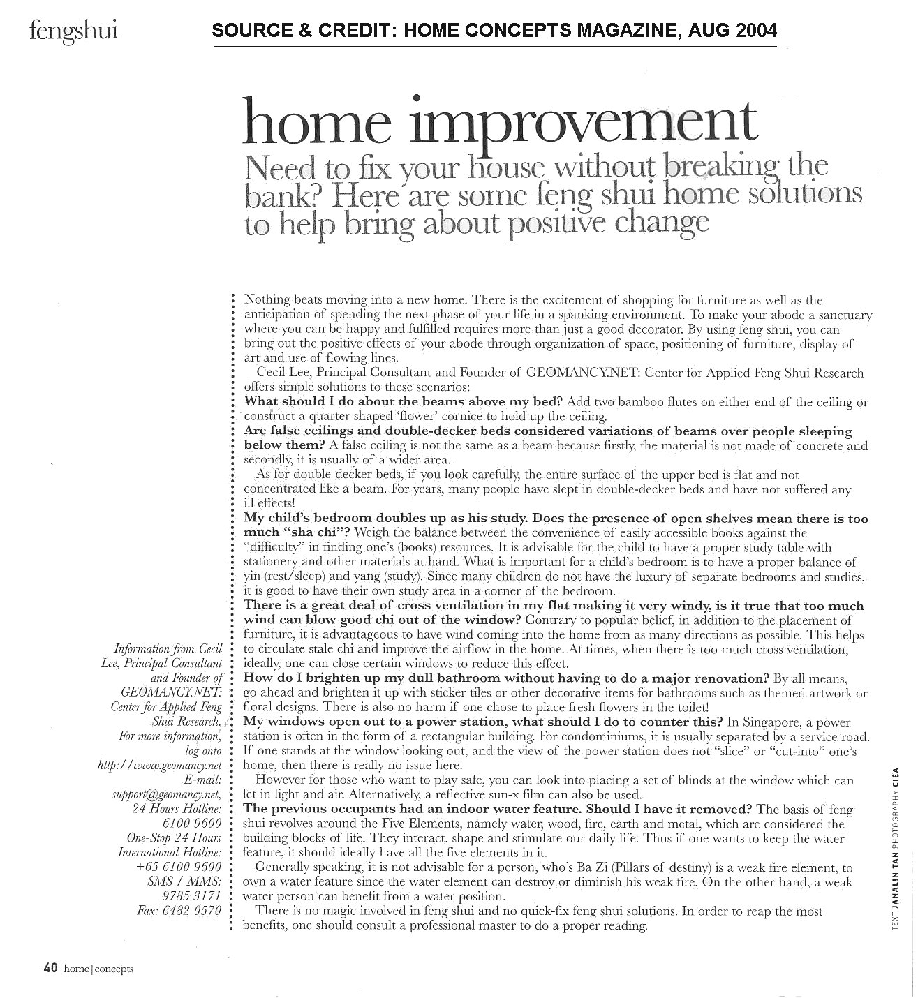 Posted August 16, 200421 yr Staff Home Improvement Need to fix your house without breaking the bank? Here are some Feng Shui home solutions to help bring positive change. Nothing beats moving into a new home. There is the excitement of shopping for furniture as well as the anticipation of spending the next phase of your life in a spanking environment. To make your abode a sanctuary where yon can be happy and fulfilled requires more than just a good decorator. By using feng shui, you can bring out the positive effects of your abode through organization of space, positioning of furniture, display of art and use of flowing lines. Cecil Lee, Principal Consultant and Founder of GEOMANCY.NET: Center for Applied Feng Shui Research offers simple solutions to these scenarios: What should I do about the beams above my bed? Add two bamboo flutes on either end of the ceiling or consfruct a quarter shaped ‘flower’ cornice to hold up the ceiling. Are false ceilings and double-decker beds considered variations of beams over people sleeping below them? A false ceiling is not the same as a beam because firstly, the material is not made of concrete and secondly, it is usually of a wider area. As for double-decker beds, if you look carefully; the entire surface of the upper bed is flat and not concentrated like a beam. For years, many people have slept in double-decker beds and have not suffered any ill effects! My child’s bedroom doubles up as his study. Does the presence of open shelves mean there is too much “sha chi”? Weigh the balance between the convenience of easily accessible books against the “difficulty” in finding one’s (books) resources. It is advisable for the child to have a proper study tabic with stationery and other materials at hand. What is important for a child’s bedroom is to have a proper balance of yin (rest/sleep) and yang (study). Since many children do not have the luxury of separate bedrooms and studies, it is good to have their own study area in a corner of the bedroom. There is a great deal of cross ventilation in my flat making it very windy, is it true that too much wind can blow good chi out of the window? Contrary to popular belief, in addition to the placement of furniture, it is advantageous to have wind coming into die home from as many directions as possible. This helps to circulate stale chi and improve the airflow in the home. At times, when there is too much cross ventilation, ideally, one can close certain windows to reduce this effect. How do I brighten up my dull bathroom without having to do a major renovation? By all means, go ahead and brighten it up with sticker tiles or other decorative items for bathrooms such as themed artwork or floral designs. There is also no harm if one chose to place fresh flowers in the toilet! My windows open out to a power station, what should I do to counter this? In Singapore, a power station is often in the form of a rectangular building. For condominiums, it is usually separated by a service road. If one stands at the window looking out, and the view of the power station does not “slice” or “cut-into” one’s home, then there is really no issue here. However for those who want to play safe, you can look into placing a set of blinds at the window which can let in light and ah. Alternatively; a reflective sun-x film can also be used. The previous occupants had an indoor water feature. Should I have it removed? The basis of feng shui revolves around the Five Elements, namely water, wood, lire, earth and metal, which arc considered the building blocks of life. They interact, shape and stimulate our daily life. Thus if one wants to keep the water feature, it should ideally' have all the five elements in it. Generally speaking, it is riot advisable for a person, who’s Ba Zi (Pillars of destiny') is a weak fire element, to own a water feature since llie water element can destroy or diminish his weak fire. On the oilier hand, a weak water person can benefit from a water position. There is no magic involved in feng shui and no quick-fix feng shui solutions. Tn order to reap the most benefits, one should consult a professional master to do a proper reading. Source & Credit: See Next Thread (Below)