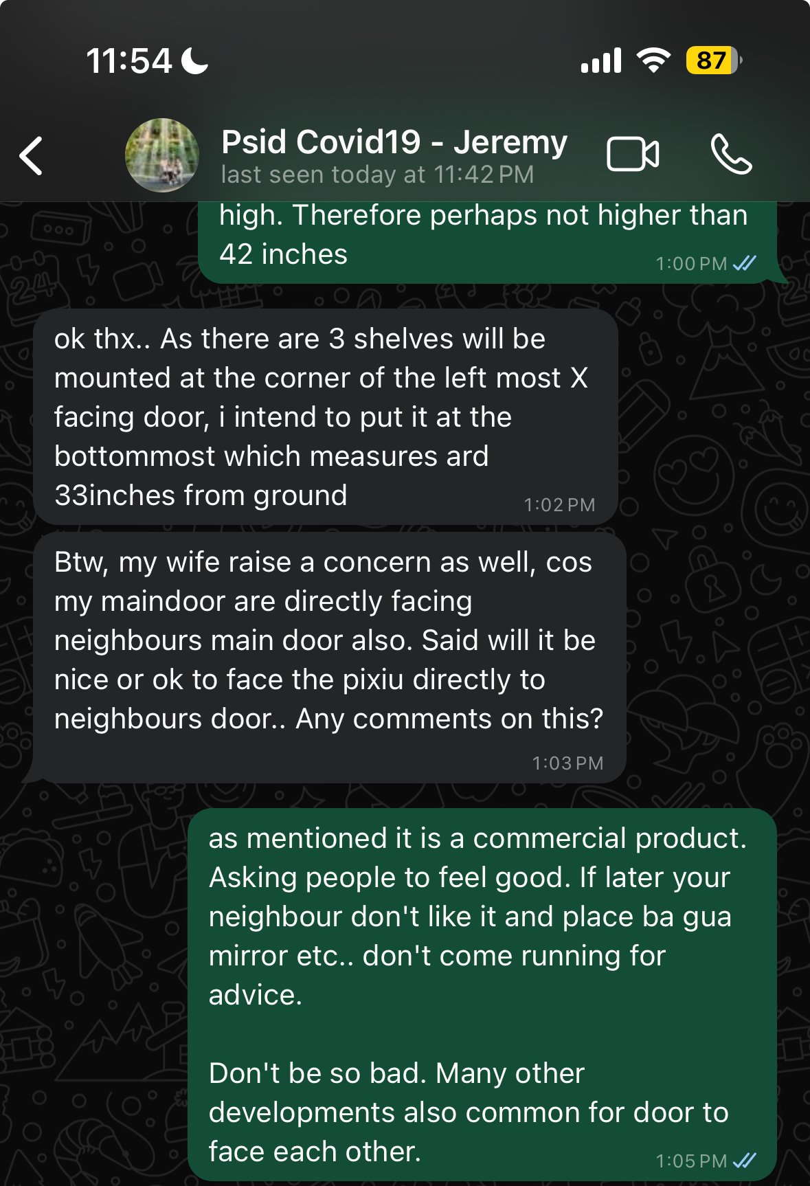 December 13, 20241 yr Author Staff Question: For my pixiu location, i placed at the X facing the main door (Left most x). I intend to make a wall mounted shelve to place the Pixiu. May i know if there are recommended height from ground? Cecil Lee's Reply: frankly these are commercial products. but many sellers say must not be too high. Therefore perhaps not higher than 42 inches ok thx.. As there are 3 shelves will be mounted at the corner of the left most X facing door, i intend to put it at the bottommost which measures ard 33inches from ground +++ This could lead to a conflict among neighbors regarding the Ba Gua. Btw, my wife raise a concern as well, cos my maindoor are directly facing neighbours main door also. Said will it be nice or ok to face the pixiu directly to neighbours door.. Any comments on this? Cecil Lee's Reply: as mentioned it is a commercial product. Asking people to feel good. If later your neighbour don't like it and place ba gua mirror etc.. don't come running for advice. Cecil Lee's Reply: Don't be so bad. Many other developments also common for door to face each other.
