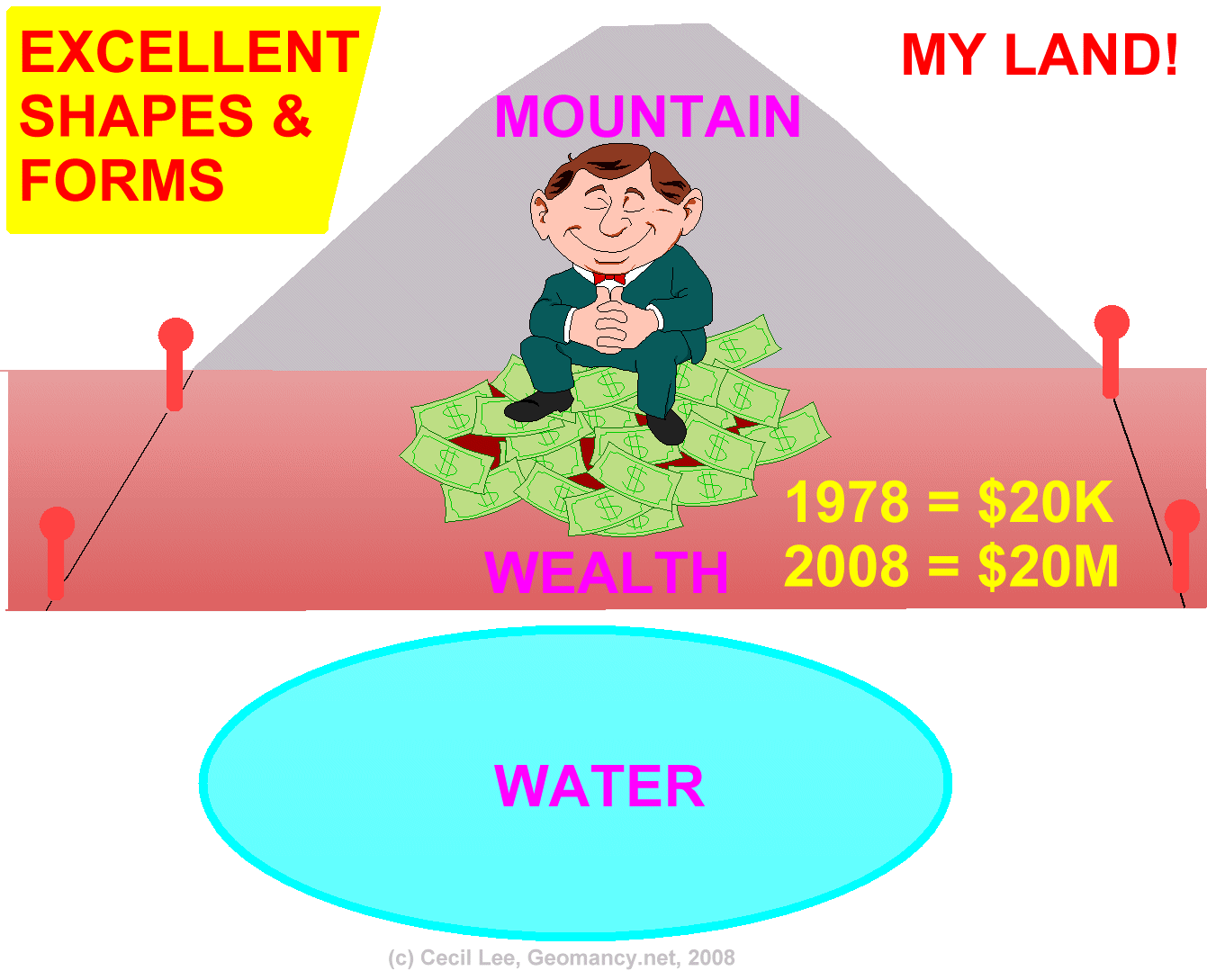Fundamentals of Shapes and Forms is that a plot of land should have clear space or water position (moving water) at the frontage and a mountain support.